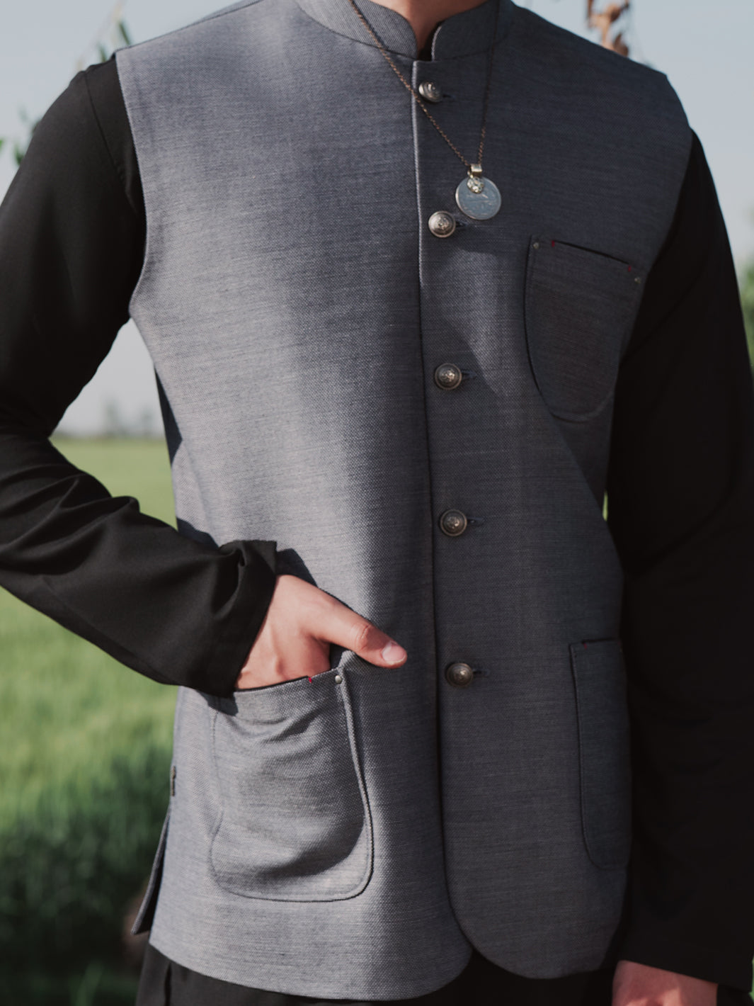 Cut and sew waistcoat featuring patch pockets and stitch details with premium quality buttons