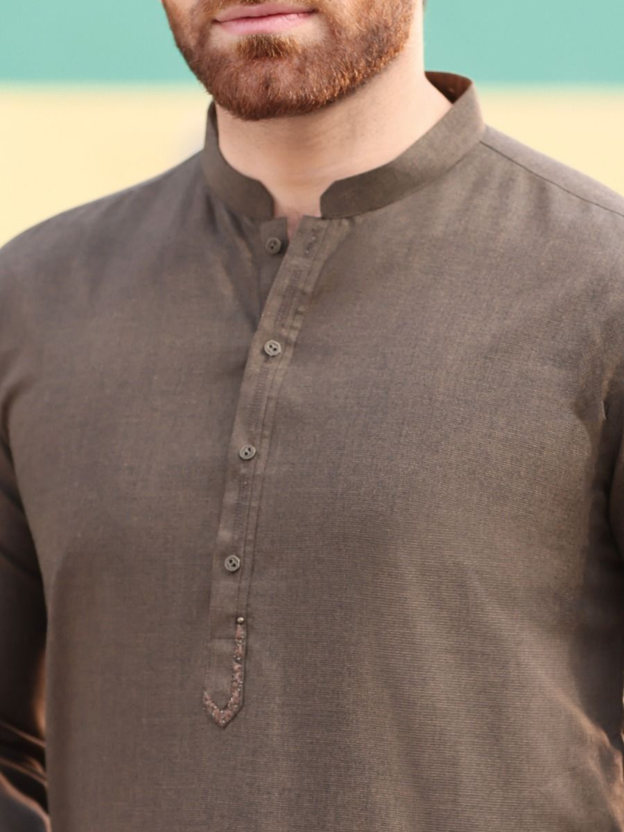 Brown Blended Fabric Kameez Shalwar With Embroidery Detail On Placket And Sleeves