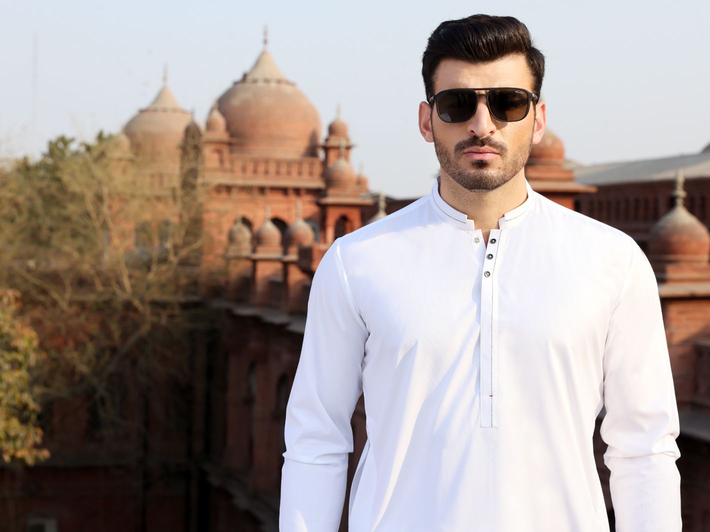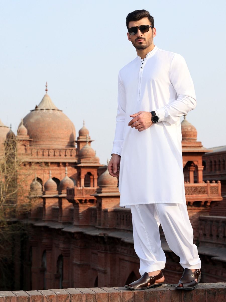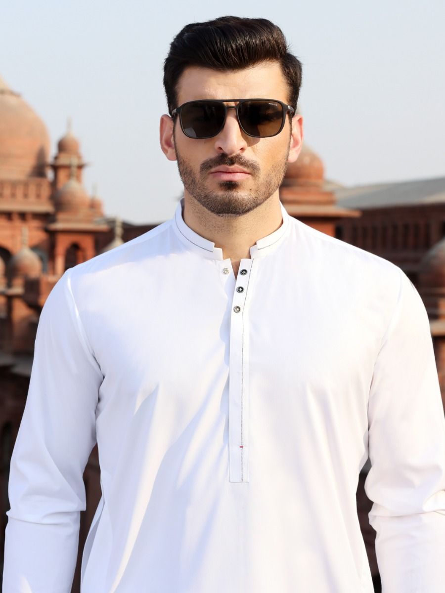 White Kameez Shalwar With Cut And Sew Detail On Placket, Collar And Sleeves