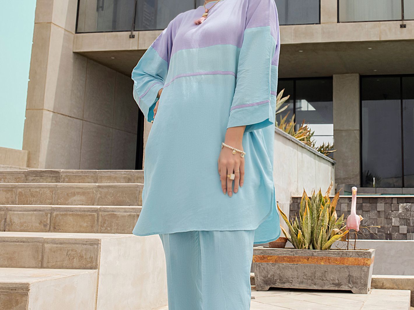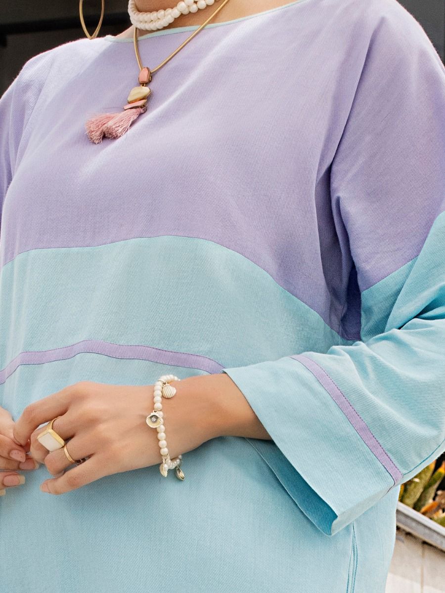 Color Blocking On Twill Fabric, Straight Shirt And Button Details On Sleeves With Cigarette Pants