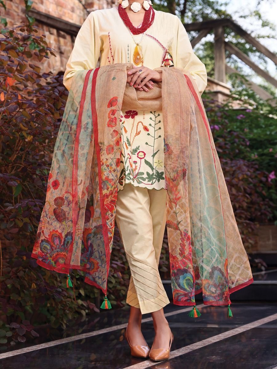 Angrakha Style Cambric Shirt With Cross Stitch Embroidery On Daman And Sleeves Paired With Pintex Cigarette Pant And Digital Printed Maysuri Poly Net Dupatta.