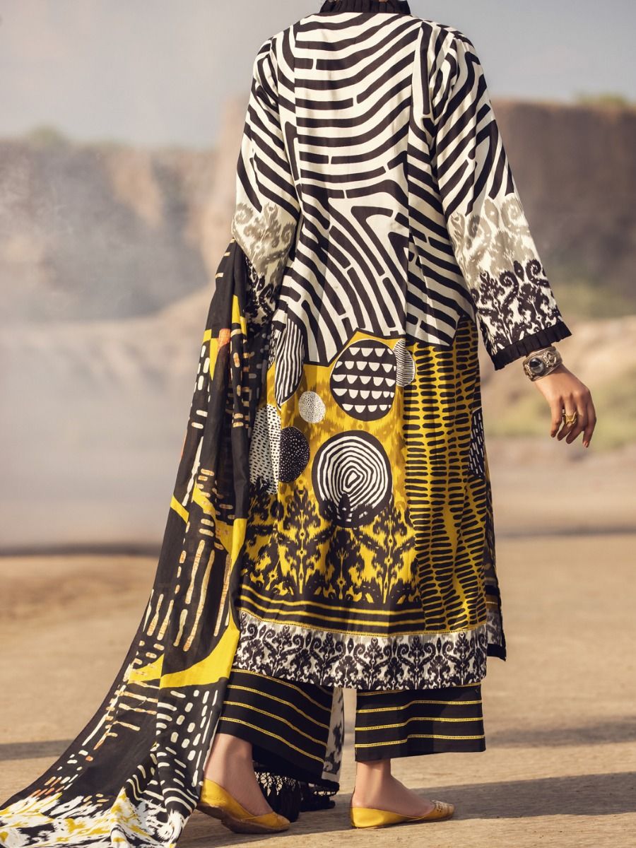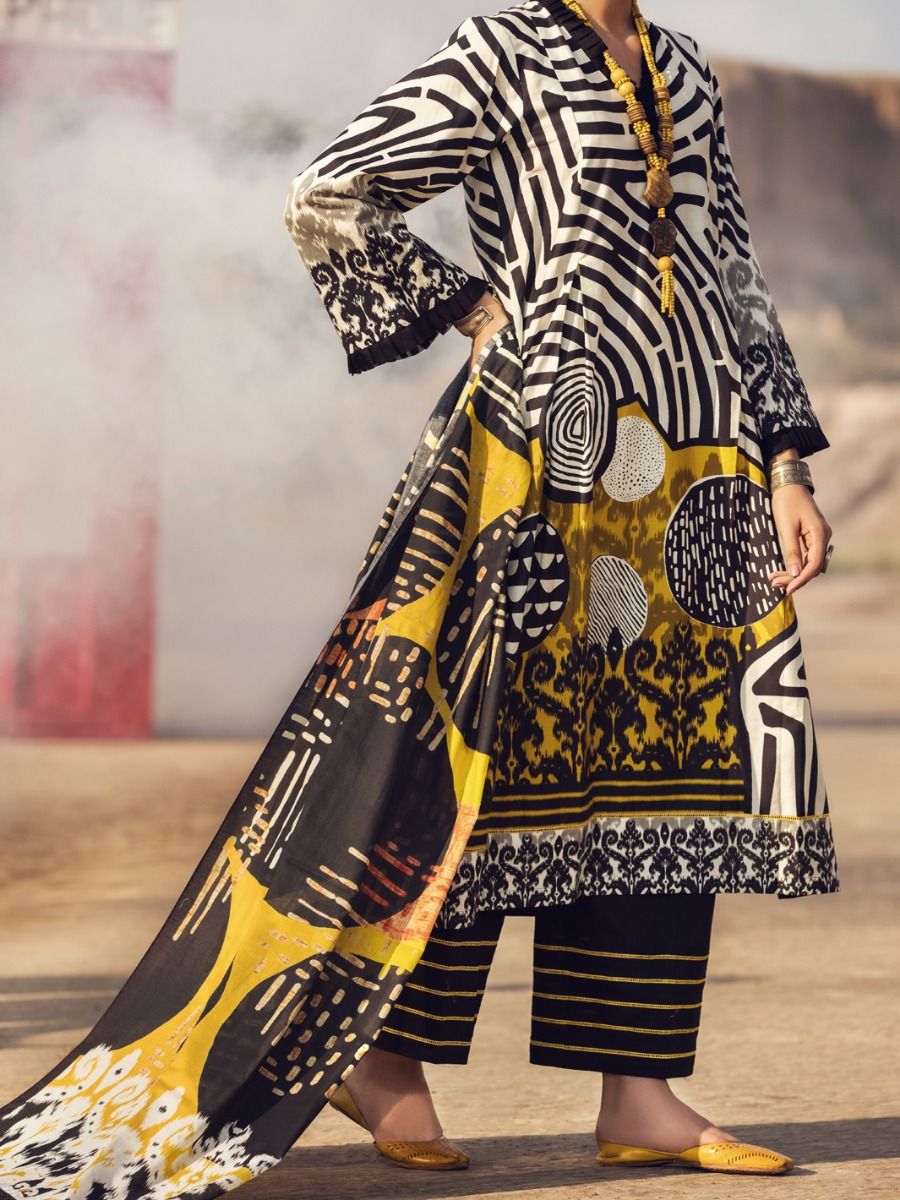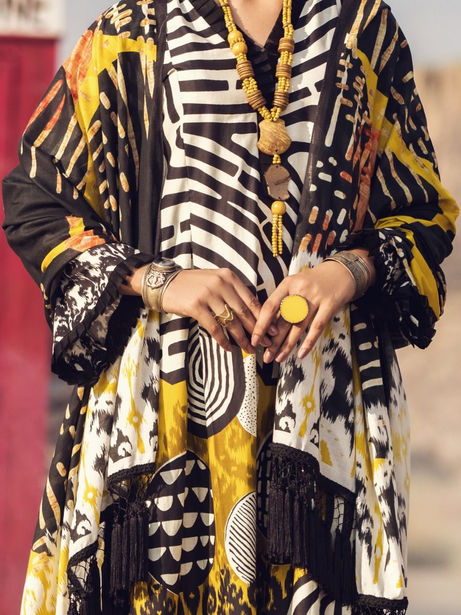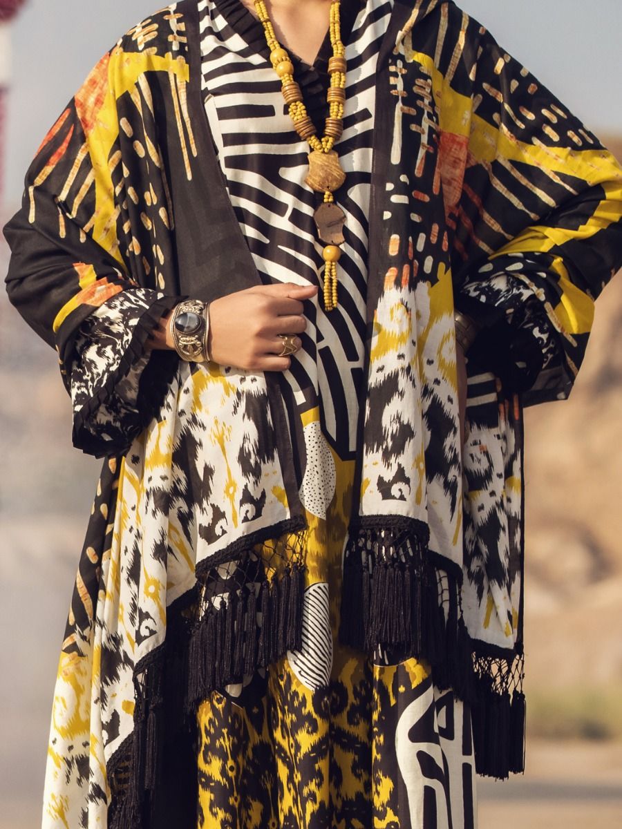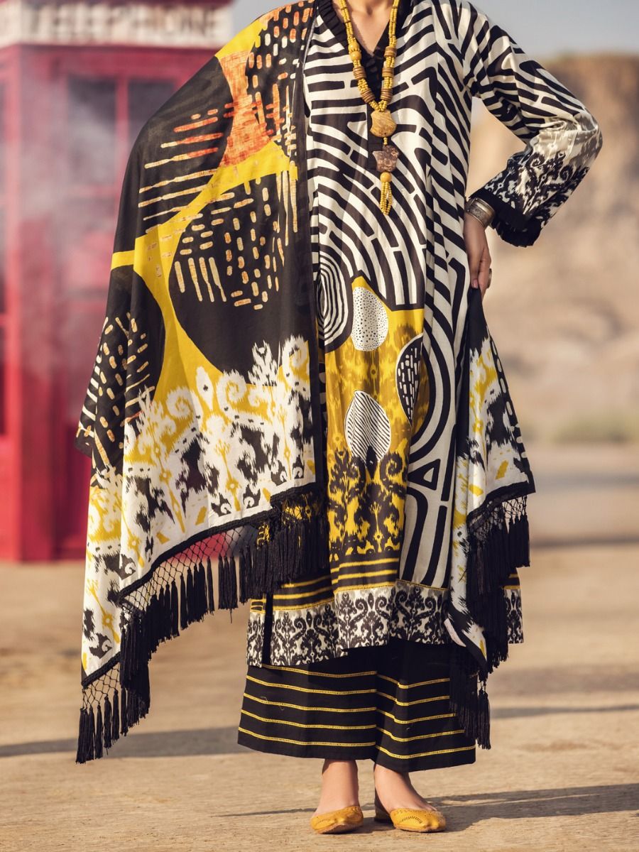 Bold Digital Printed Cambric Shirt Detailed With Frills. Paired With Cambric Culottes Detailed With Contrasting Appliqued Trims And Digital Printed Cambric Dupatta Embellished With Tassel Lace.