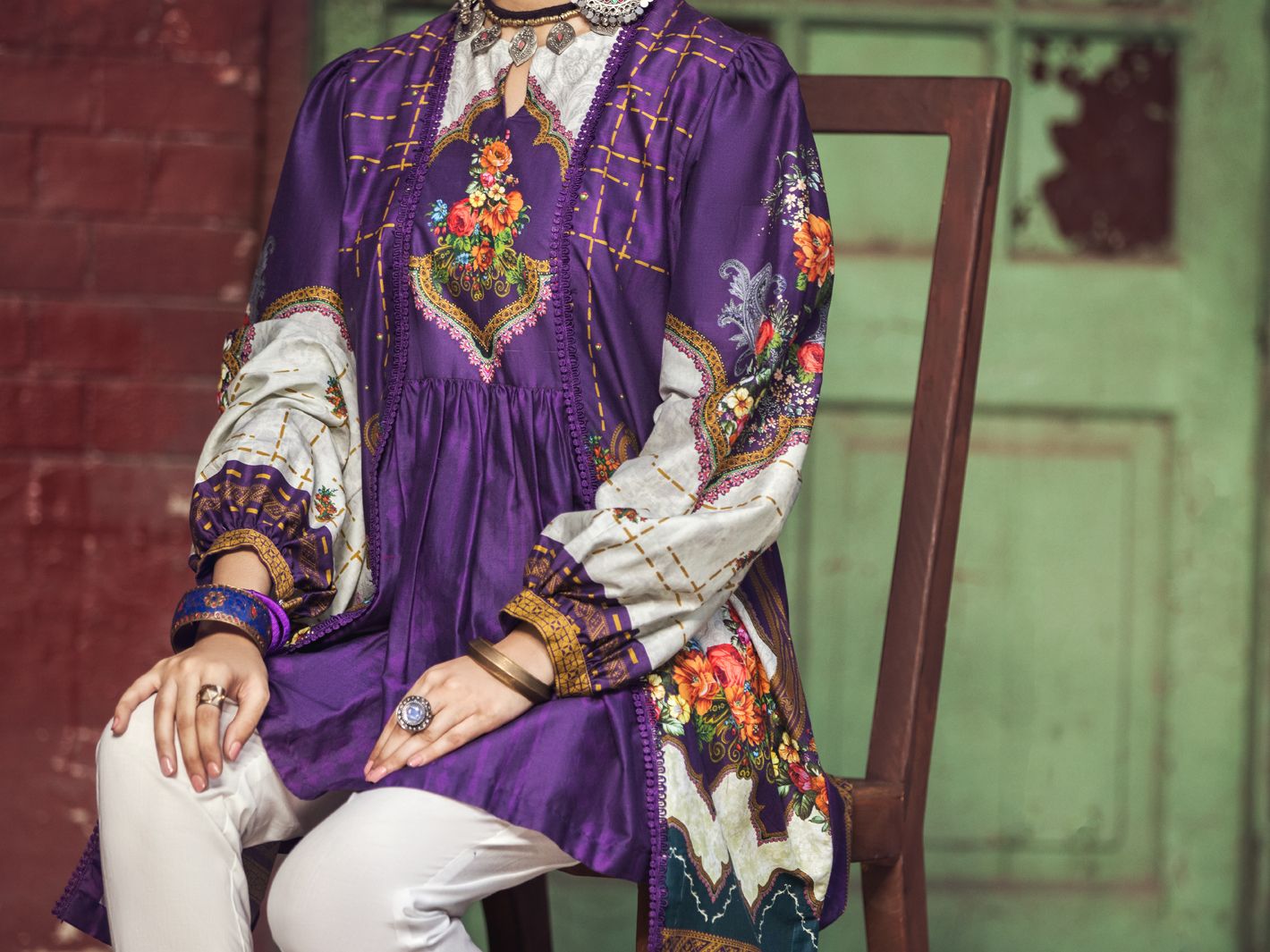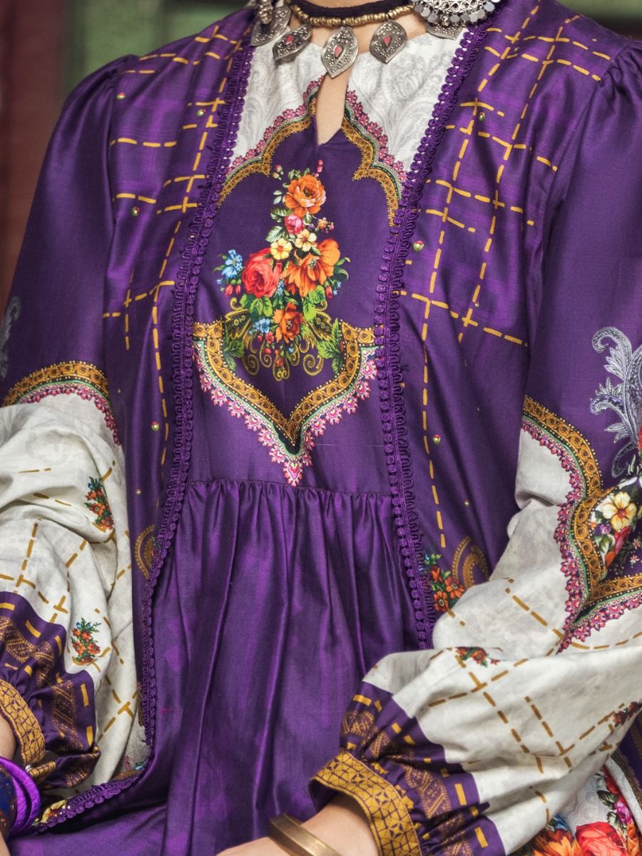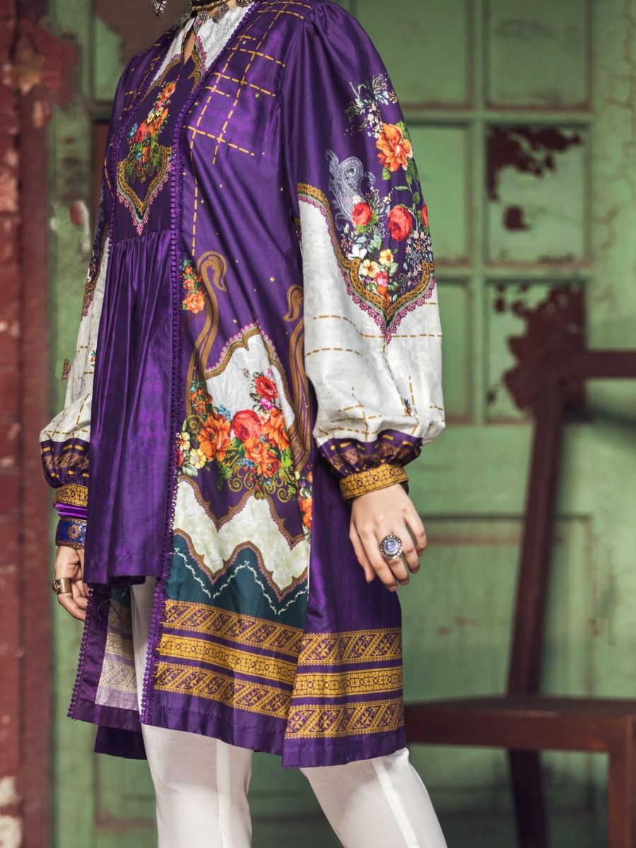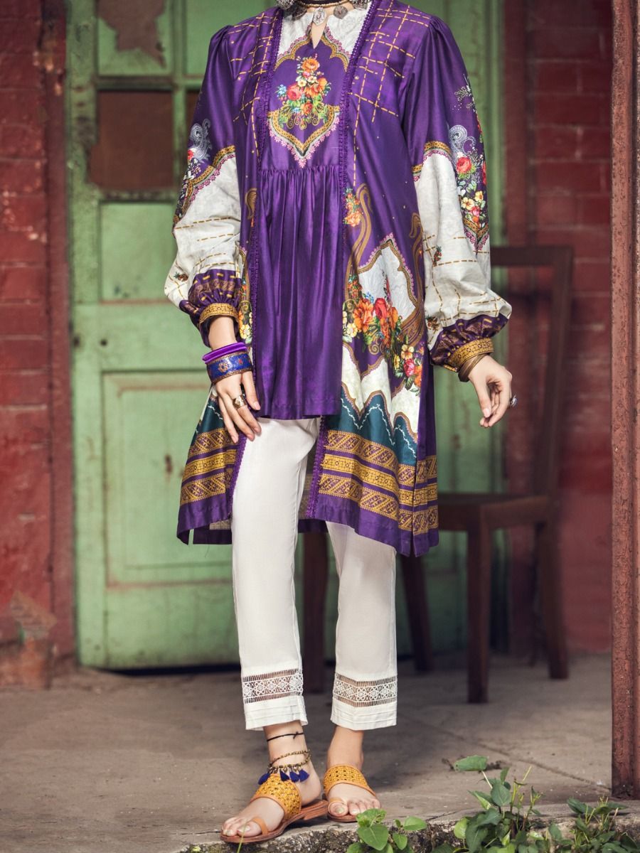Hi-Low Front Open Style Digital Printed Kurti With Gathers On Front And Sleeves. Enhanced With Lace Details On Front.