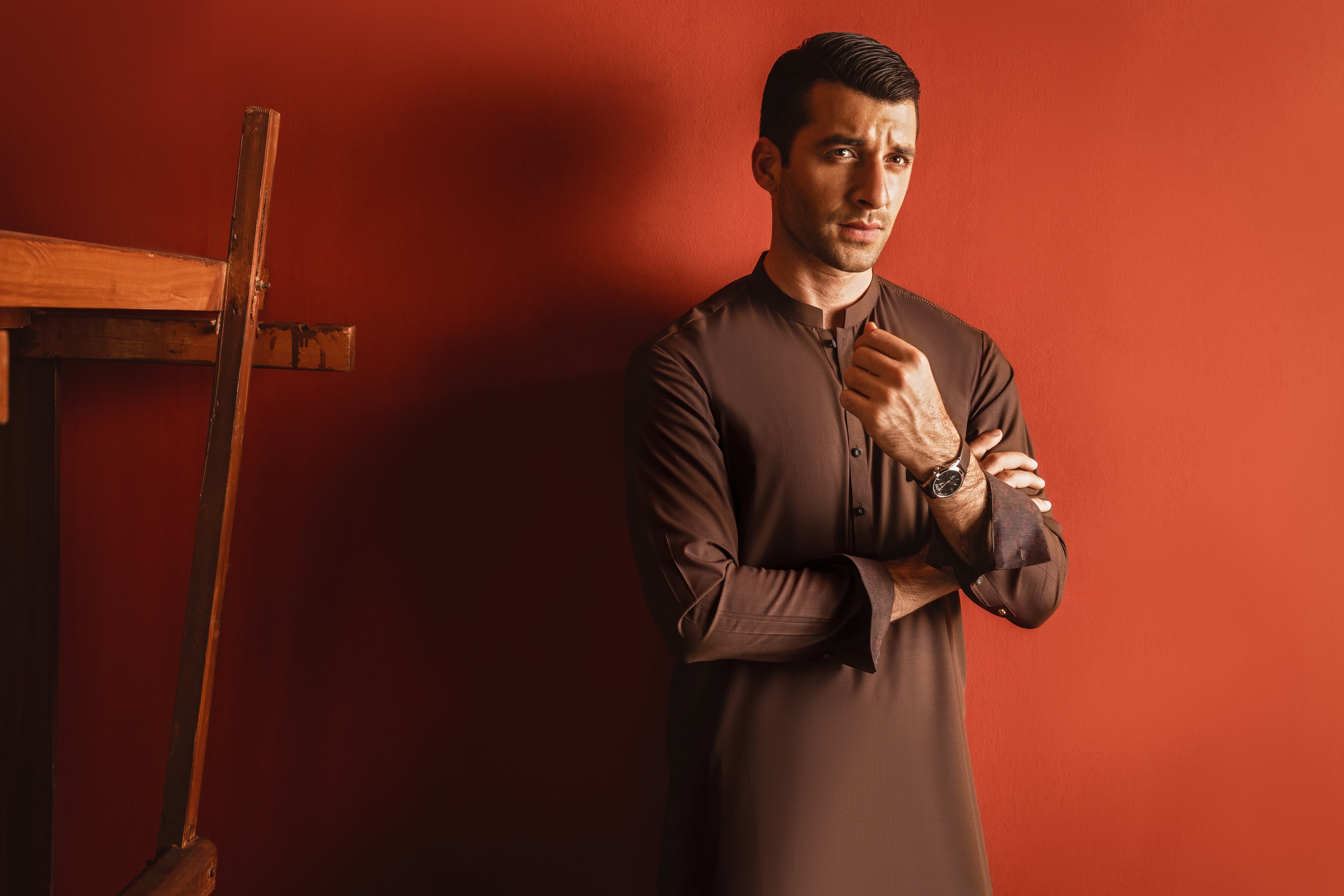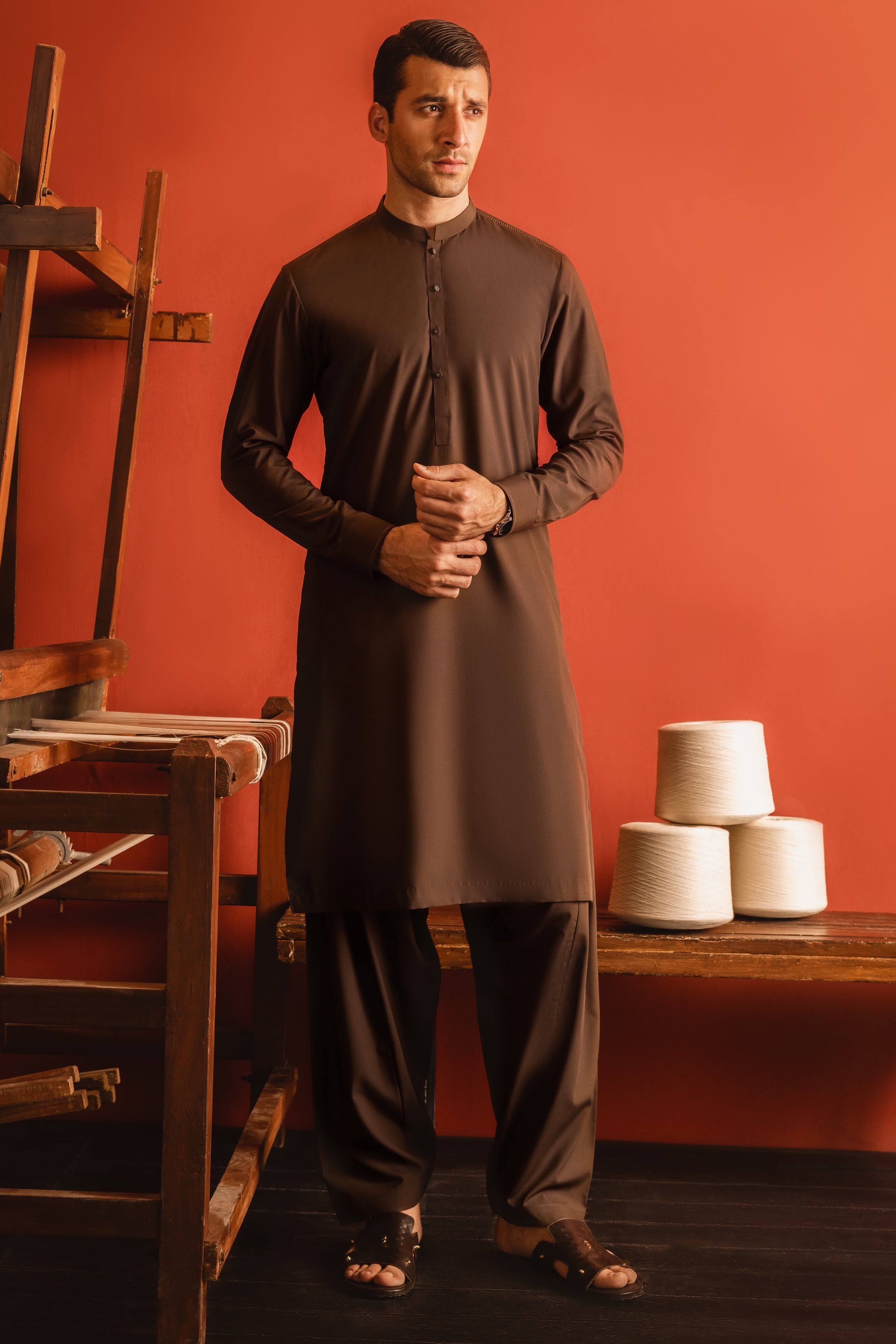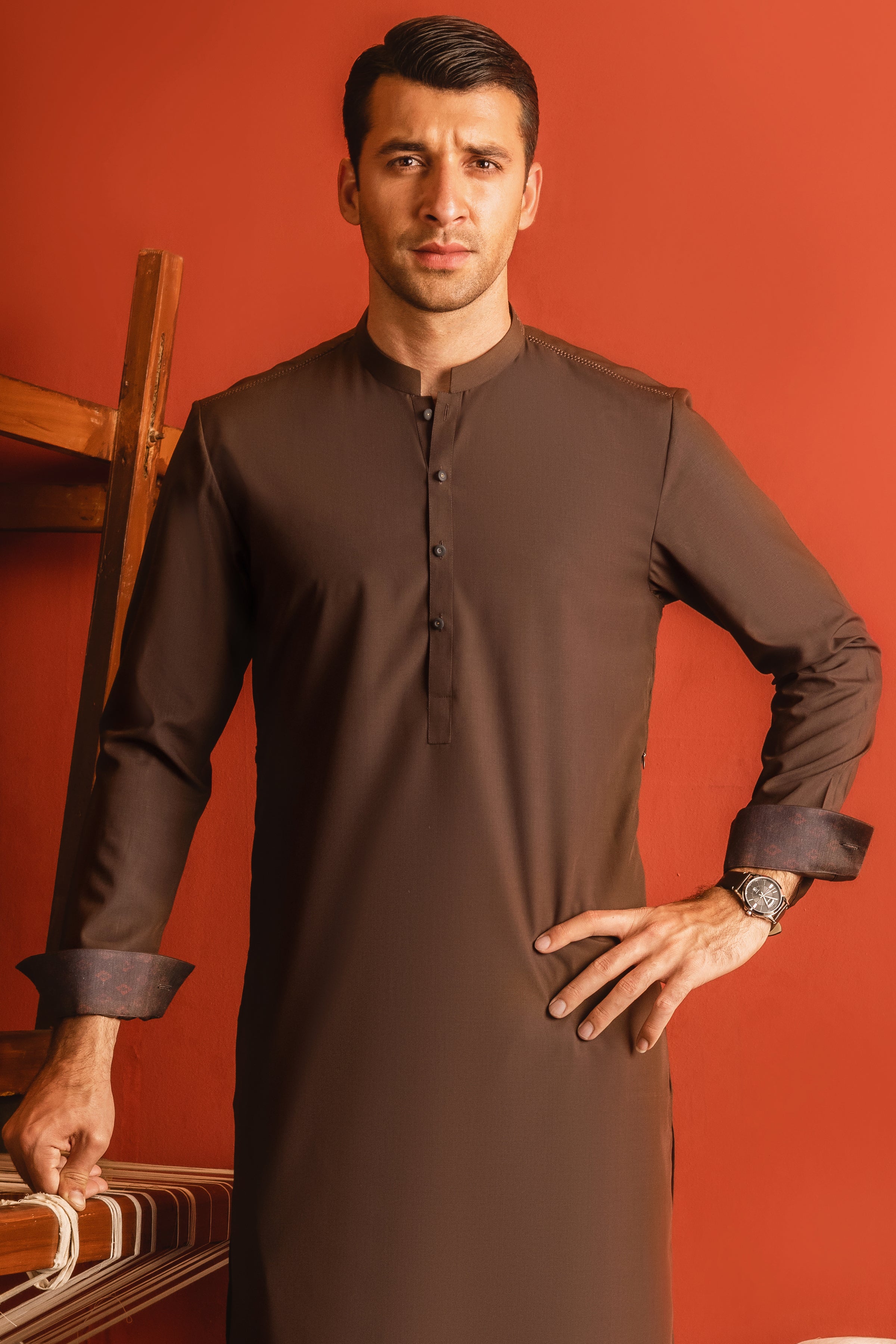 Crafted from a sumptuous premium blended fabric in the richest of browns, Tokyo is a landscape defined by its simplicity and elegance. Meticulously tailored with a clean Mandarin collar and simple buttons along its front placket and triple buttoned cuffs, it is finished with a similarly toned shalwar.