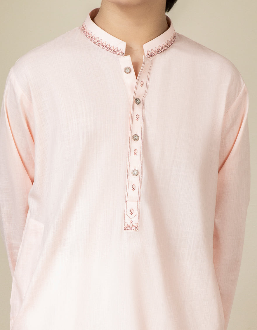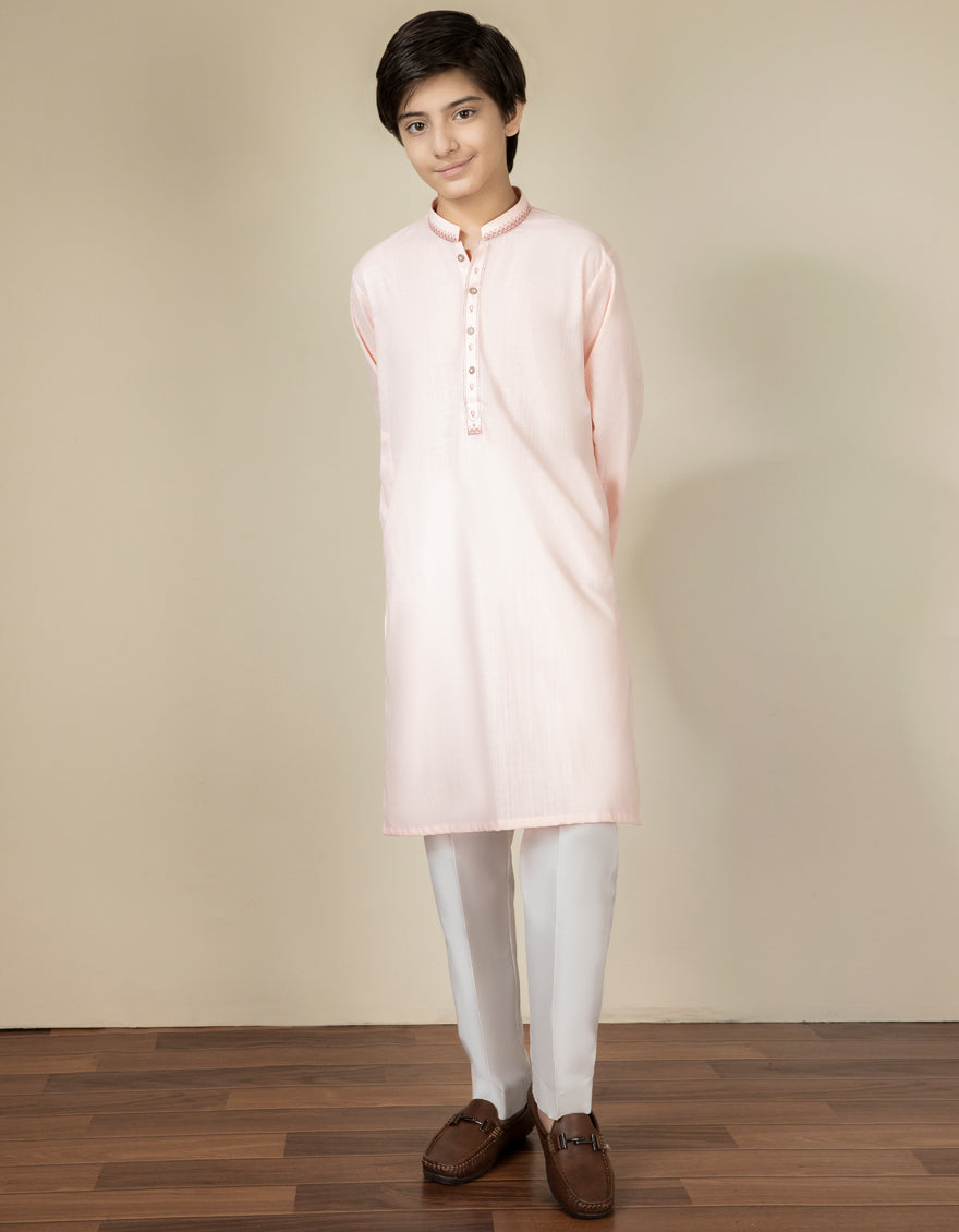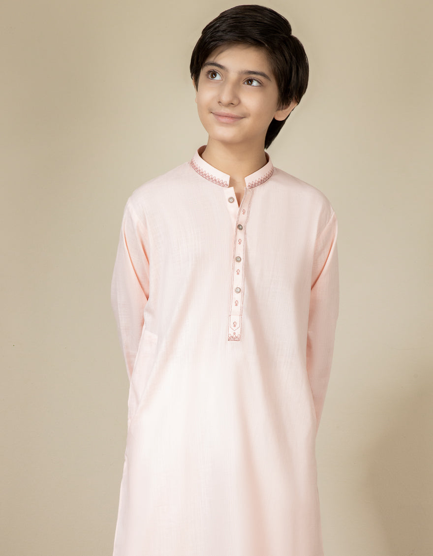 Casual Computerized Kurta For Kid, Embroidery At Collar, Placket & At Sleeves Hem As Well At Yoke¦