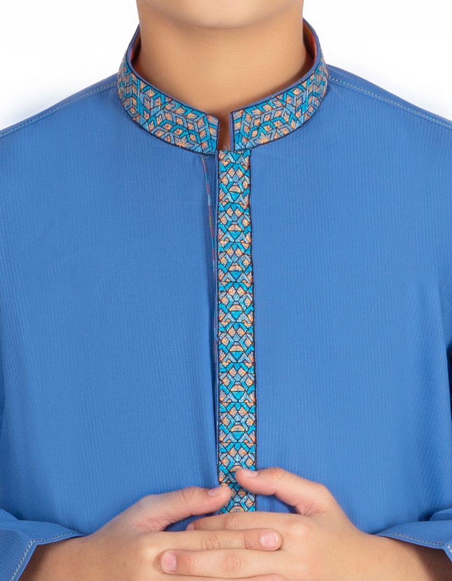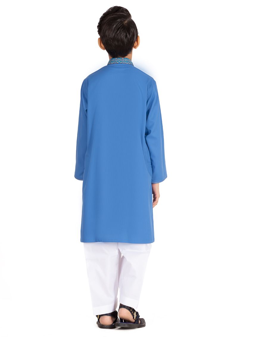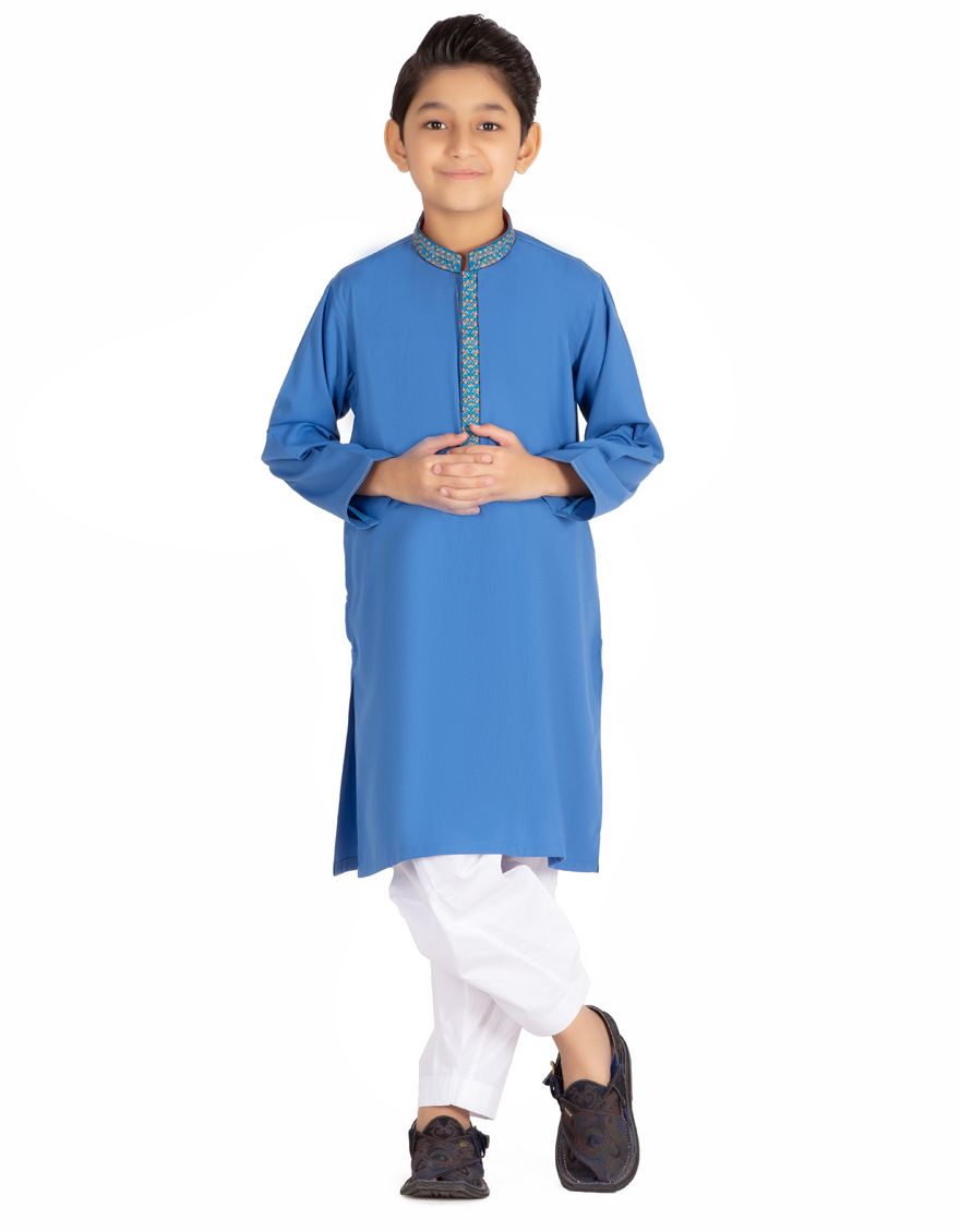 Kids Kurta Computer Semi-Formal Embroidery At Collar, Front Placket, And Contrast Use At Button Take & Collar Inside, Stitching Detail On Shoulder And At Sleeves Hem.