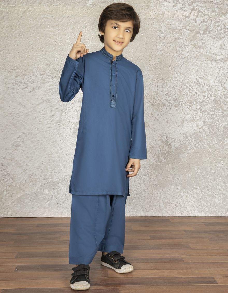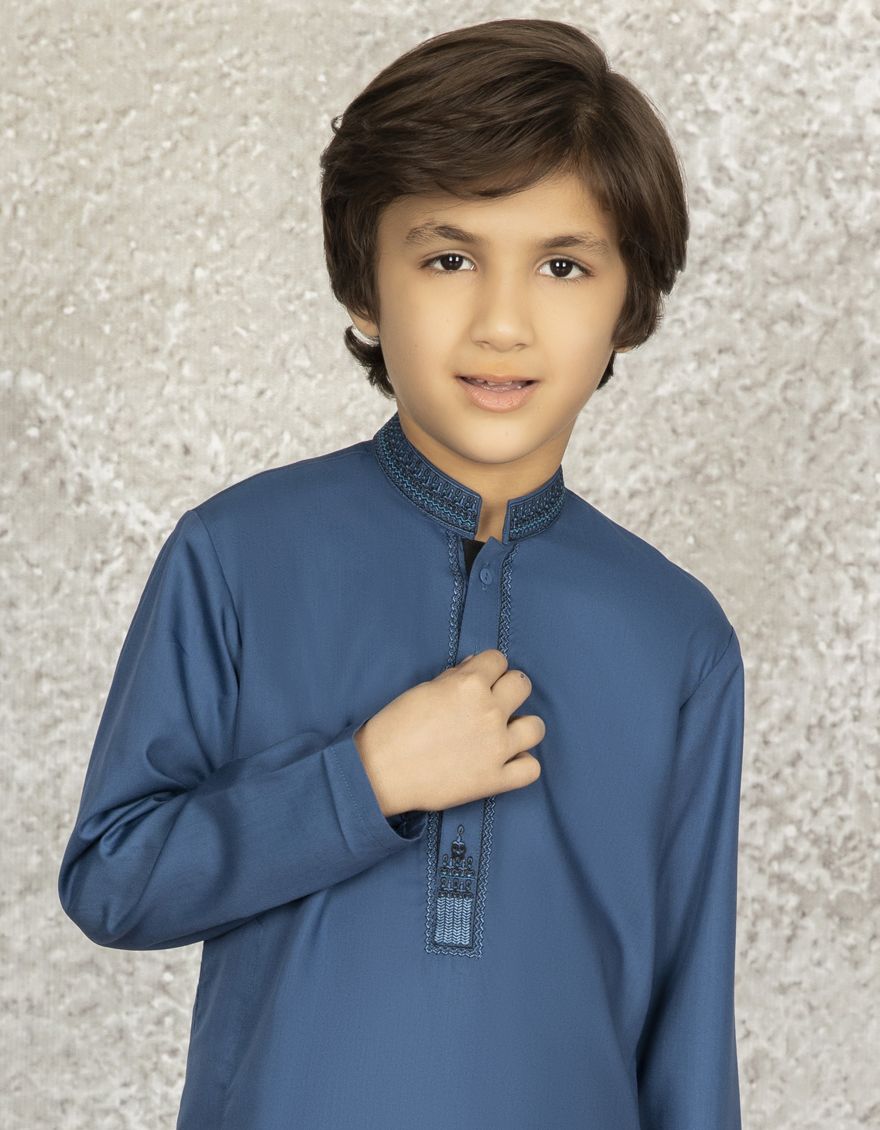 Semi-Formal Suit For Kid, Embroidery On Collar, Placket And Front With Contrast Fabric Inside Placket.