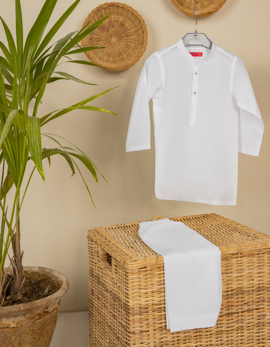 White Plain Kurta For Infant With Contrast Fabric Inside Placket And Back Yoke.