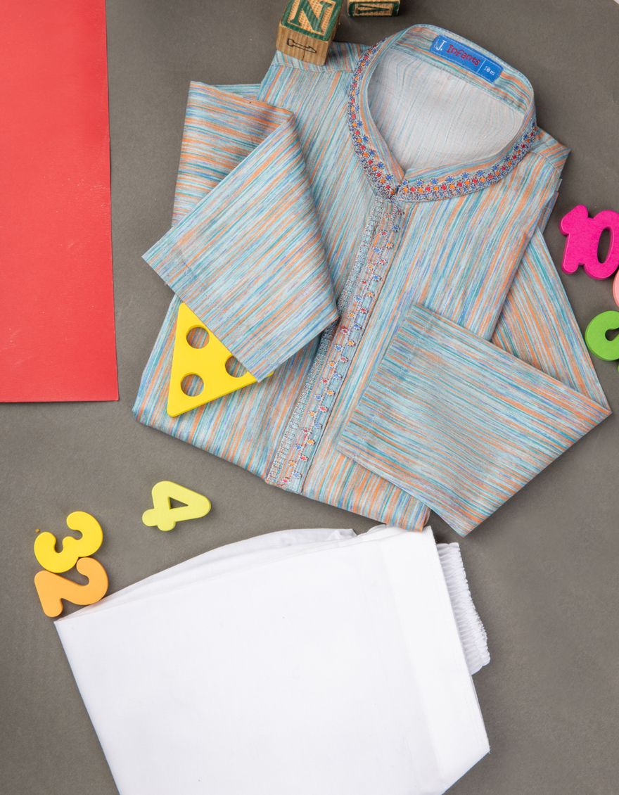 Semi-Formal Kurta For Infants On Lawn Fabric With Contrasted Computer Embroidery On Collar And Front Placket.