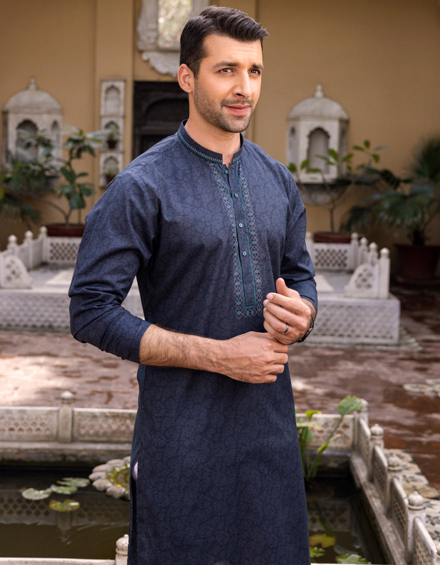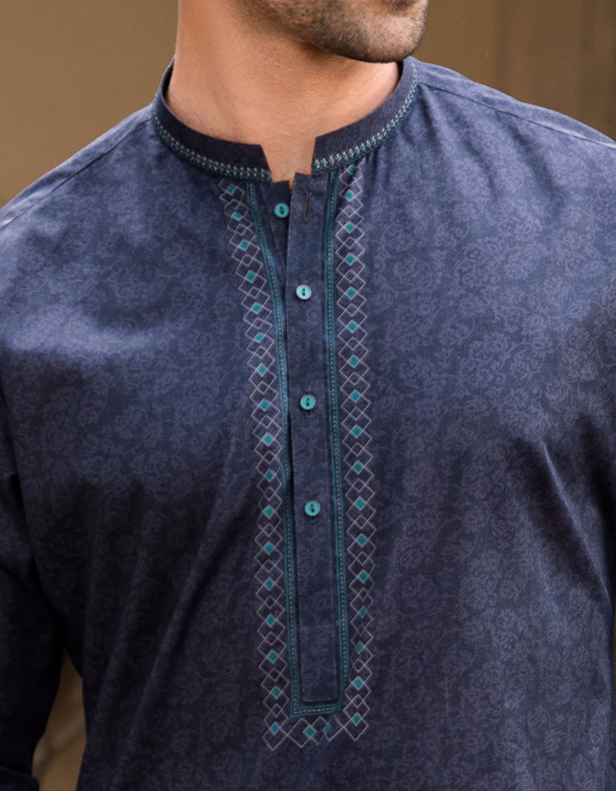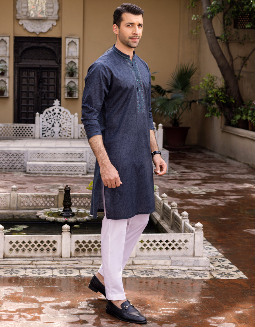 Semi-Formal Lawn Kurta For Men, With S.Print And Embroidery