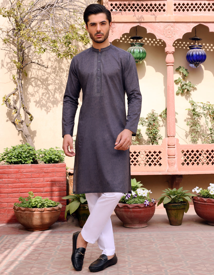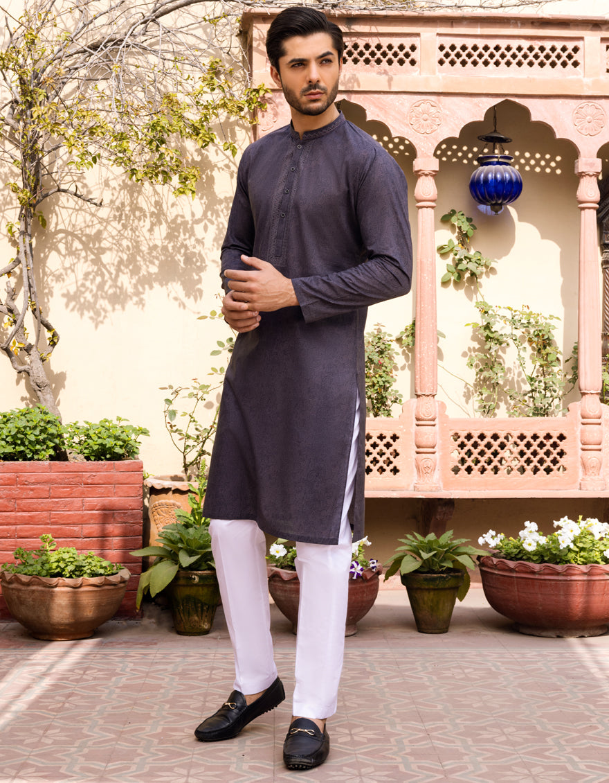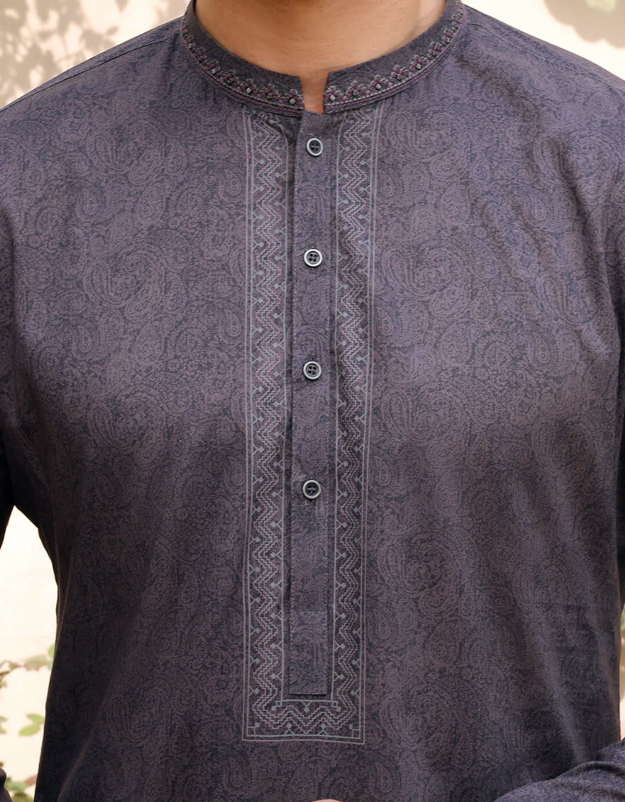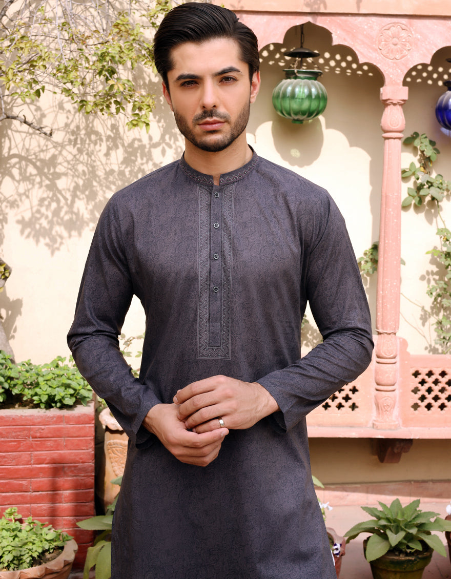 Semi-Formal Lawn Kurta For Men, With S.Print And Embroidery