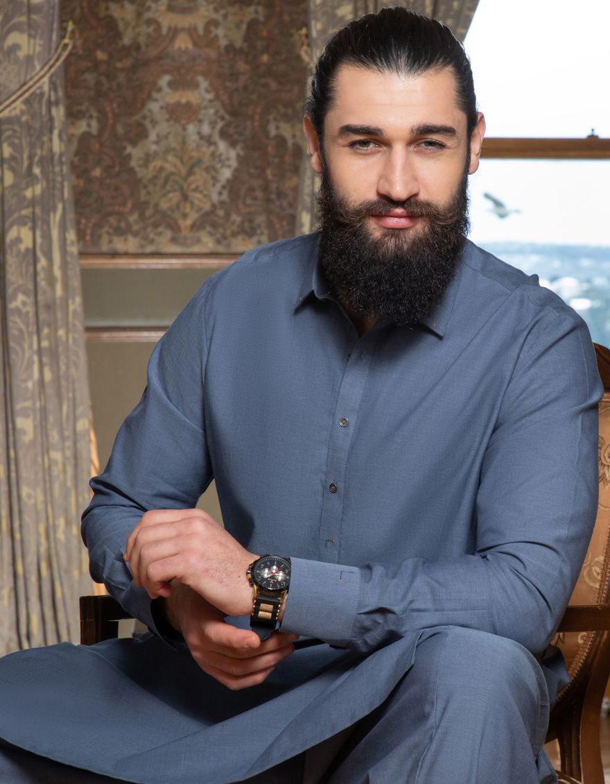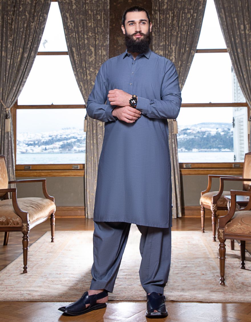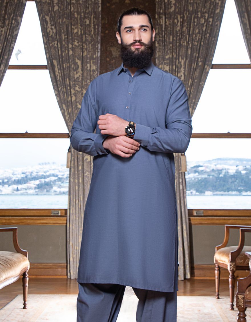 Casual Kameez Shalwar For Men, With Cuts Work On Cuff & Placket.