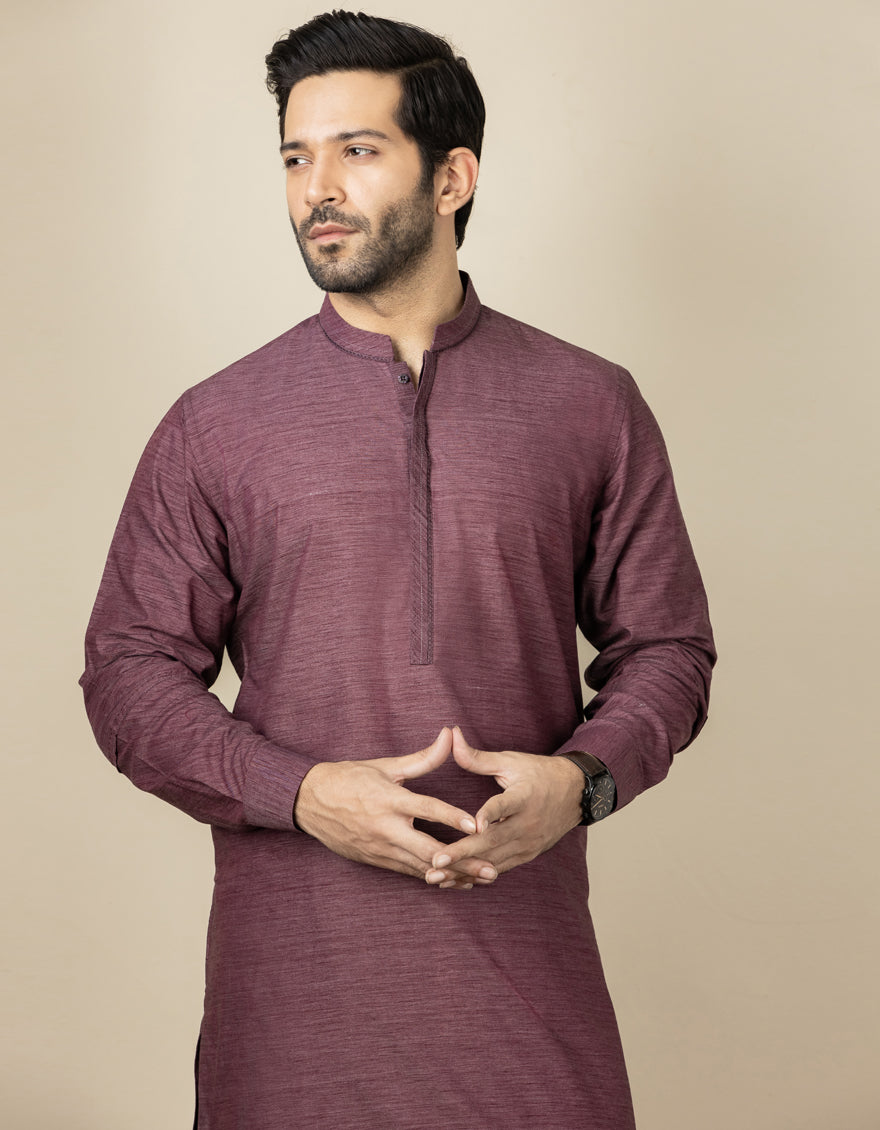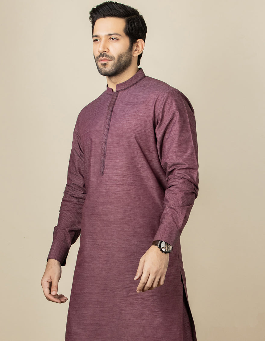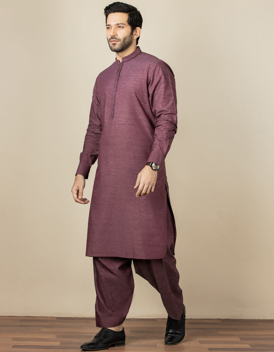 Dark Purple Casual Suit For Men, With Comp + Cuts Work On Collar, Placket And Sleeves