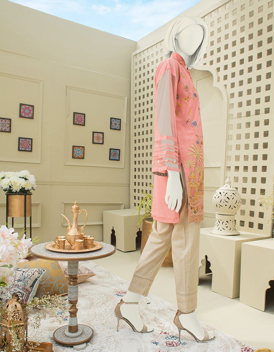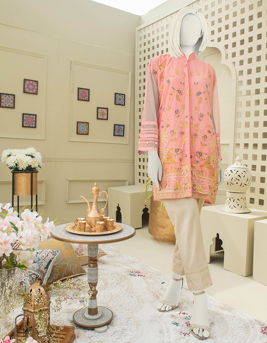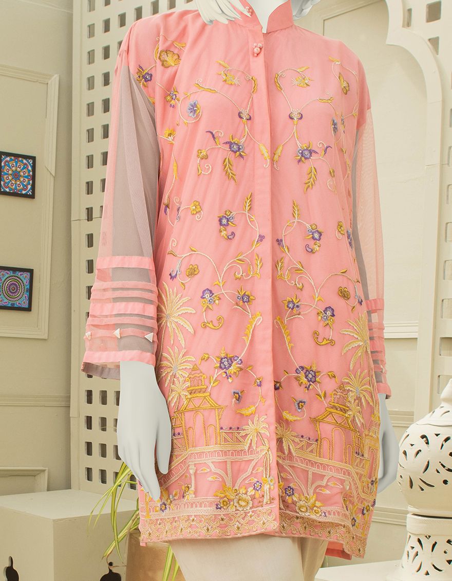 Collection Type: Embroidered Dyed Poly-Net Shirt With Crape Inner