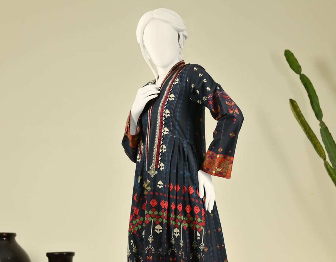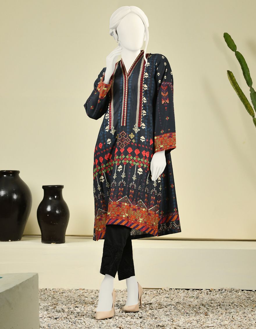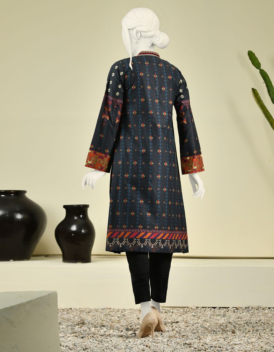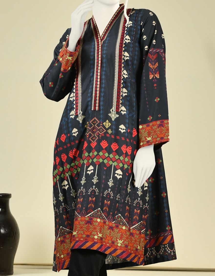 Description: 1pc Cambric Printed Kurti With Embroidered Borders Used On Placket.