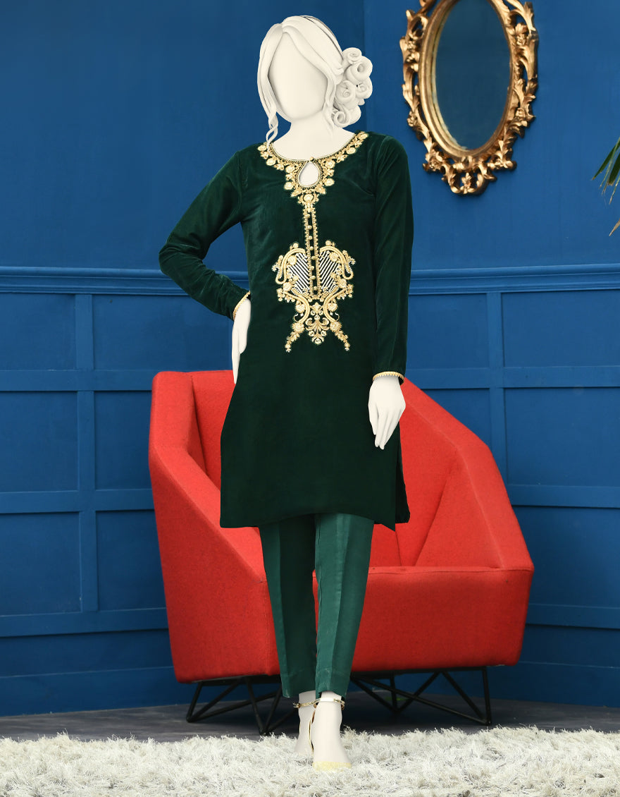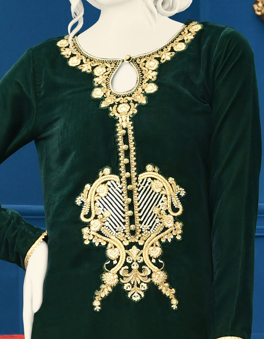 Description: Green Velvet Kurta With Heavy Embroidery On Neckline.