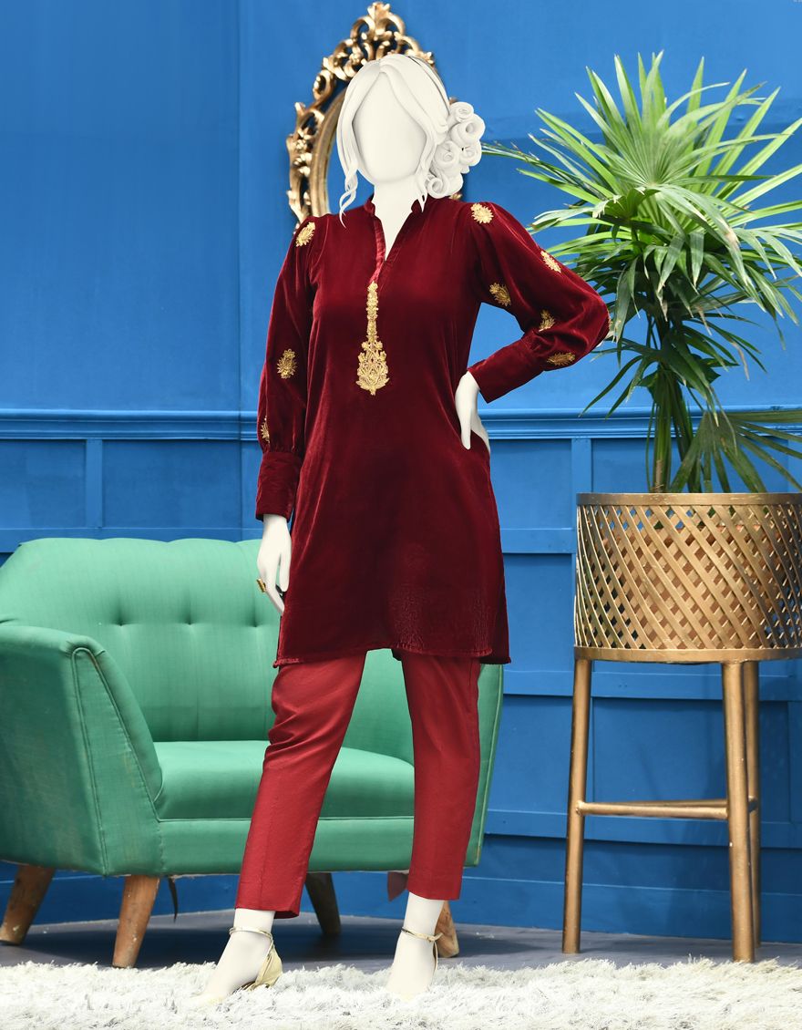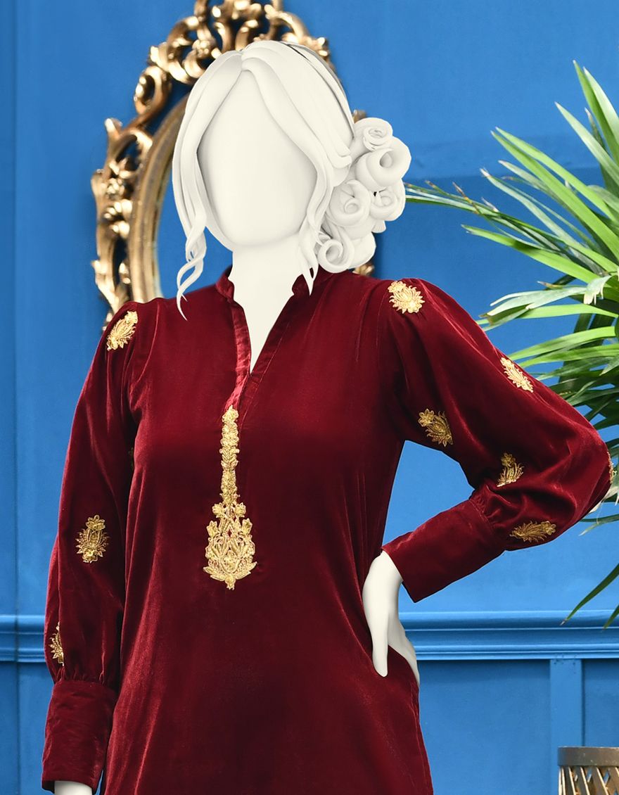 Description: 1 Pc Velvet Kurti With Stylized Embroidered Sleeves With Cuff And Buttons And Nice Embroidered Placket On Front.