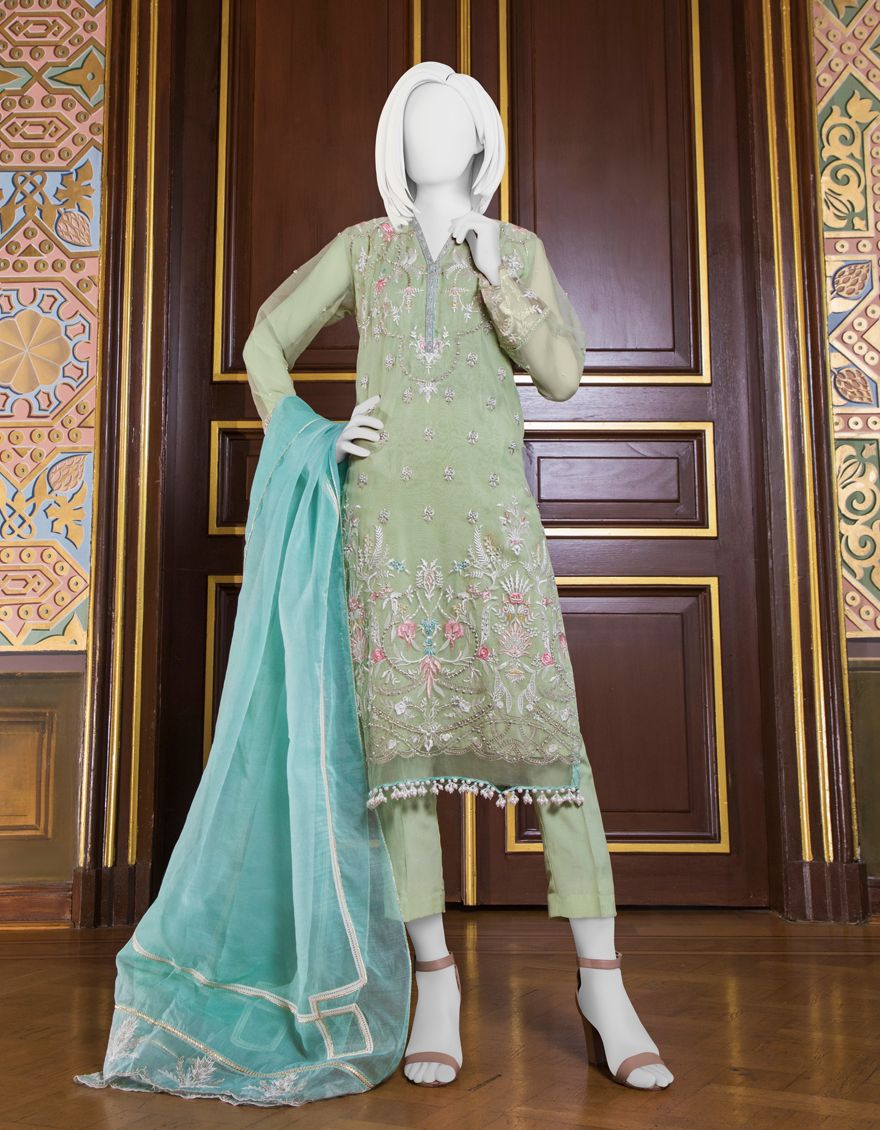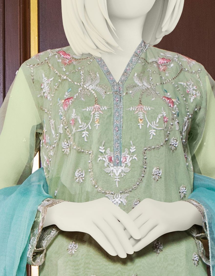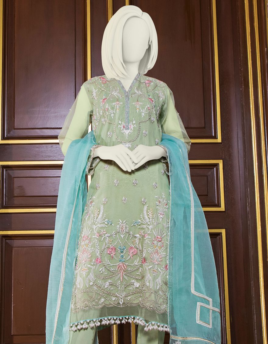 GREEN ORGANZA 3PC UNSTITCHED | JJLS-S-JFU-US-21-702 FB/MF-663