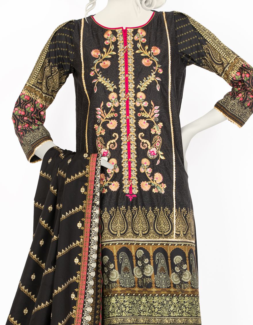 Description: 3Pc Embroidered Printed Suit With Plain Dupatta And Lace Used As Embellishment.