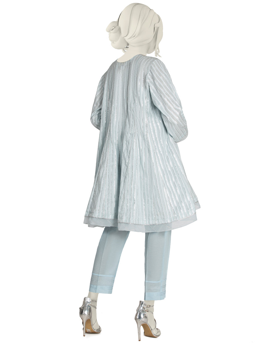 Embellishment: Shirt Neckline Is Finished With Button Detail. Sleeves, Panels And Hem Are Finished With Champa And Organza With Pin Tucks Detail. Trouser Are Finished With Zari Stitched Detail.