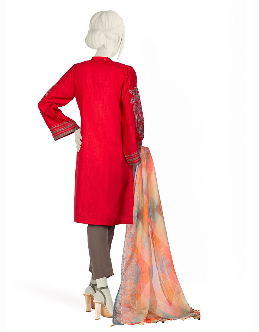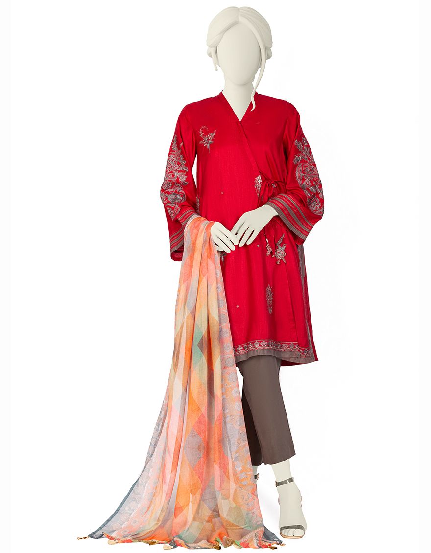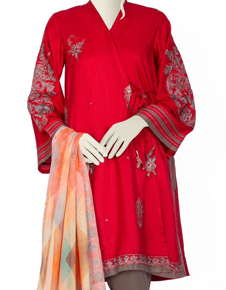 Collection Type: Embroidered Dyed Raw Silk Shirt - Dyed Basic Satin(100% Cotton) Trouser - Basic Mill Print Impure Silk Dupatta