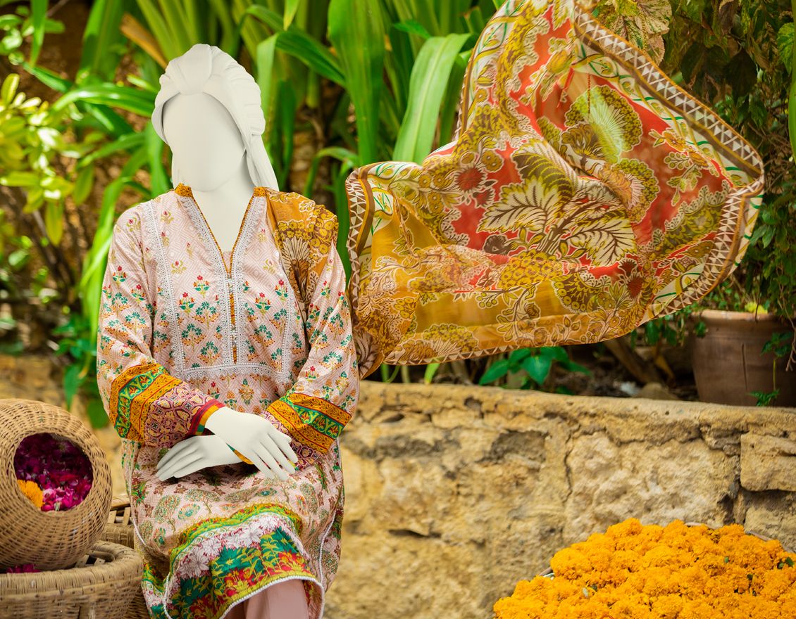 Basic Mill Print Lawn Shirt - Dyed Laced/Cut Lawn Trouser - Basic Mill Print Impure Chiffon Dupatta
