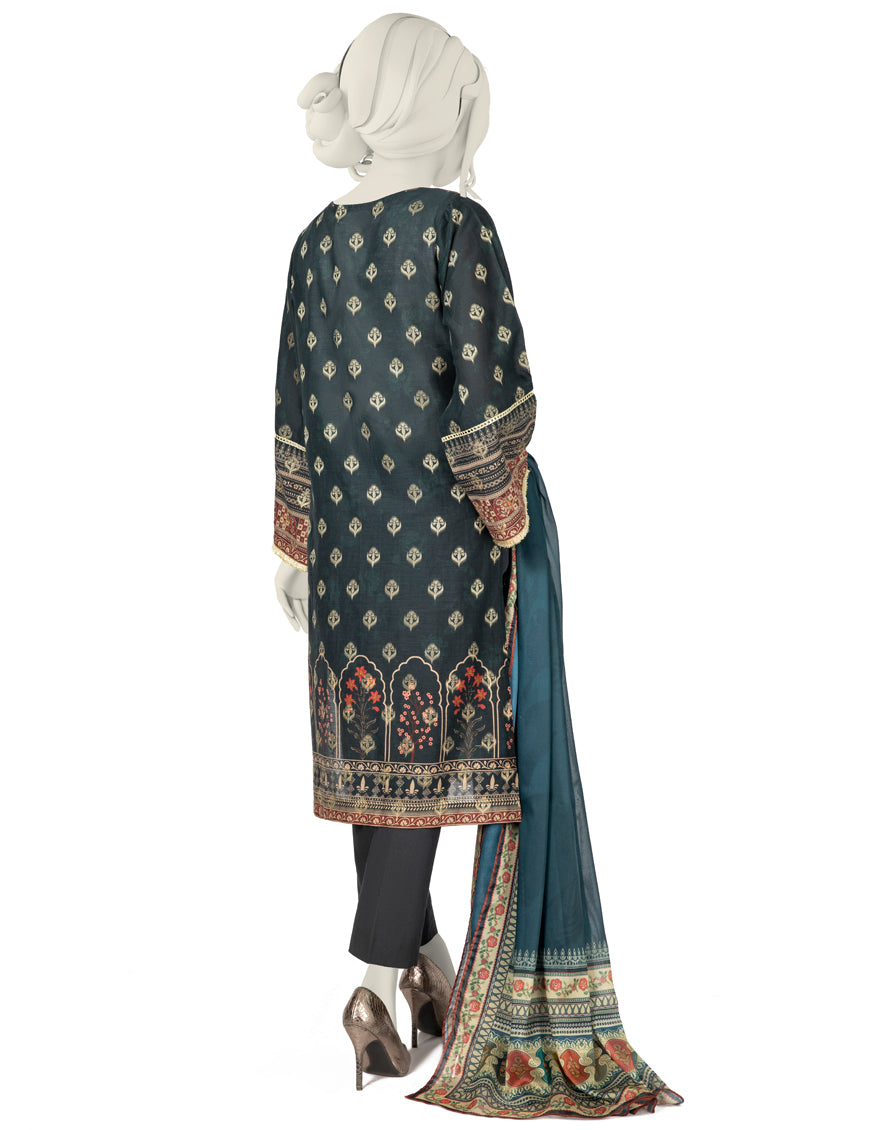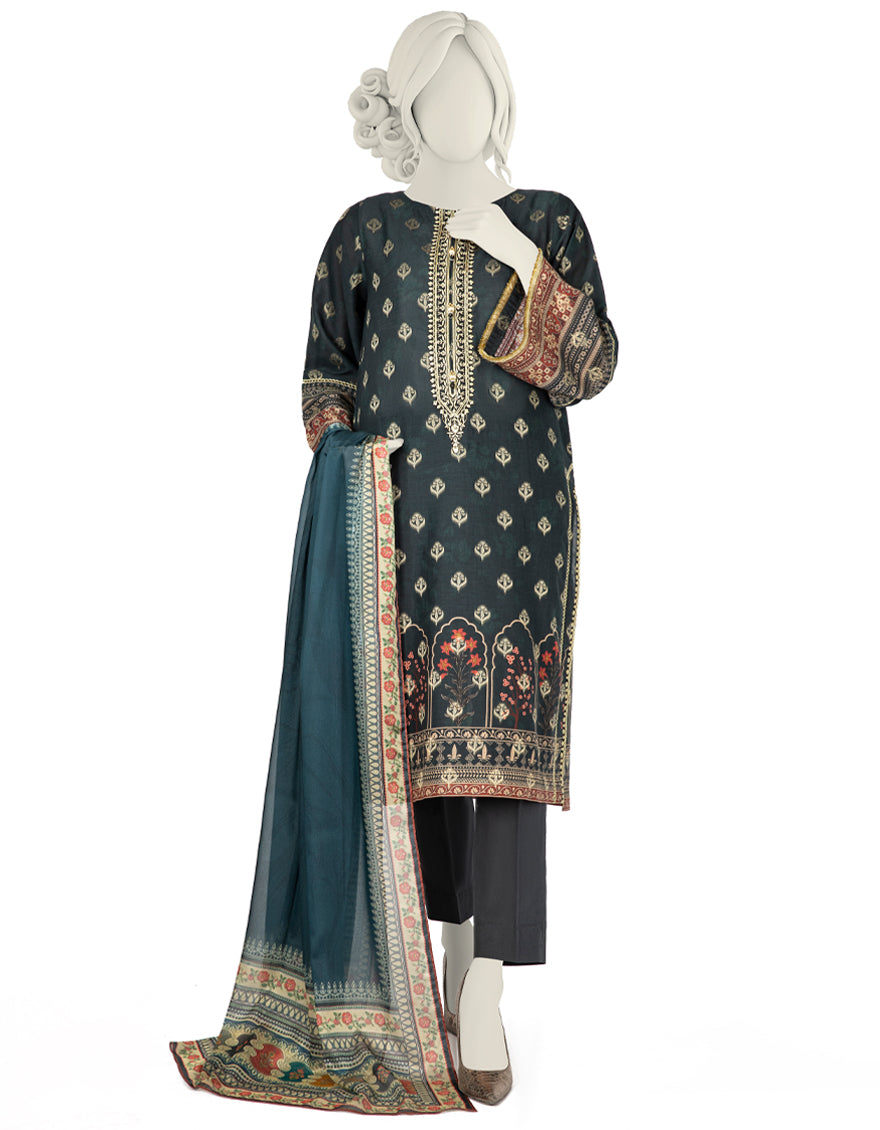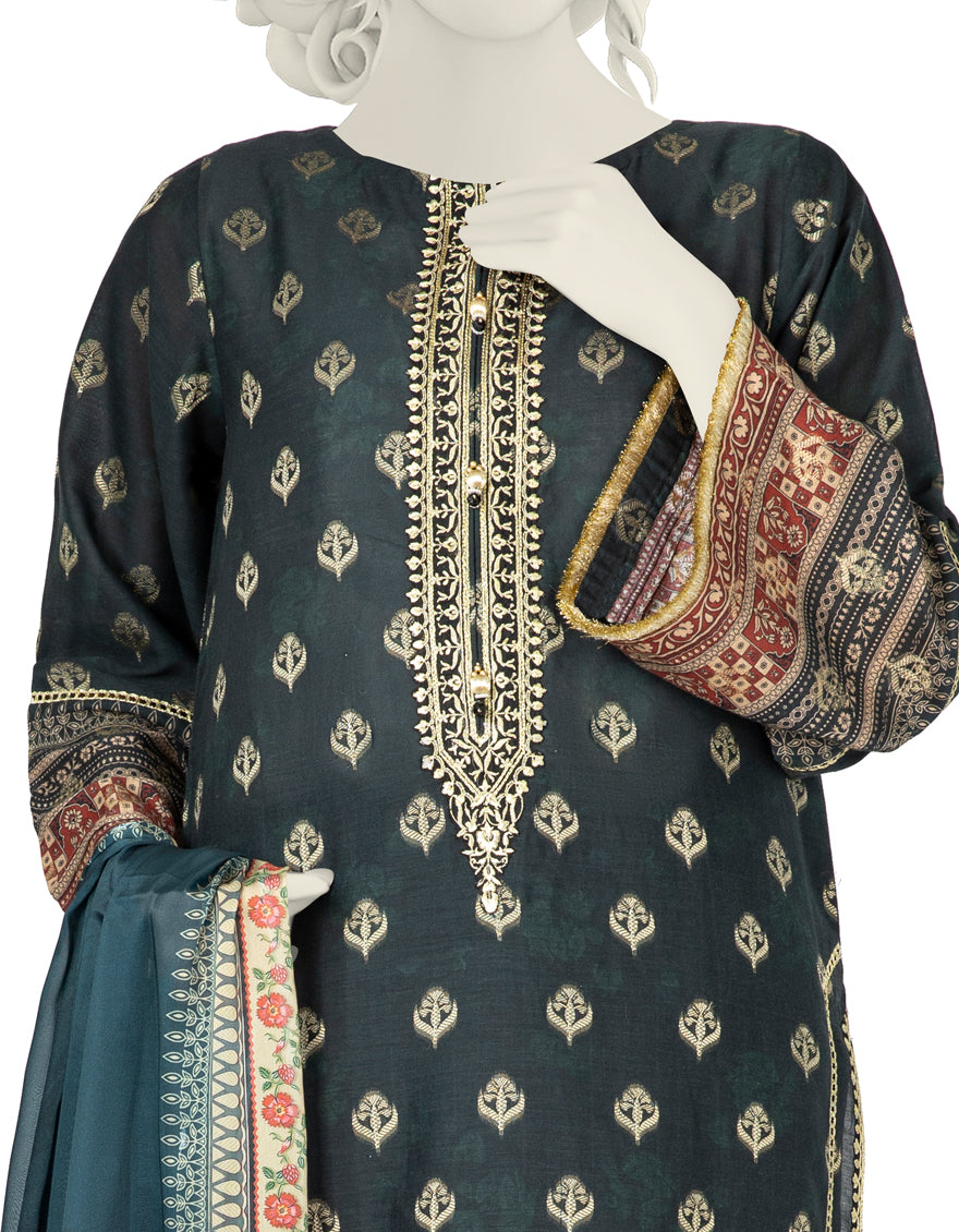 Collection Type: Embroidered Digital Printed Jacquard Shirt & Silk Dupatta With Trouser
