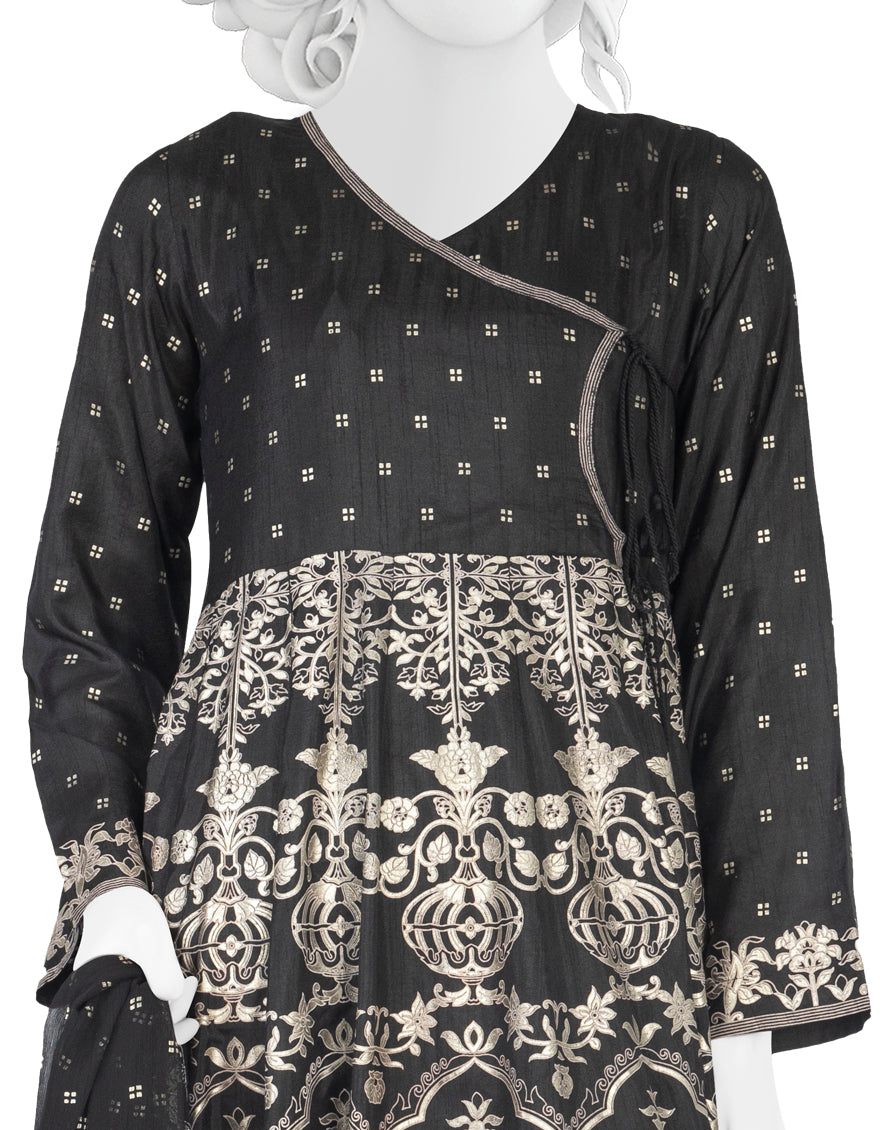 Collection Type: Embose & Foil Printed Silk Shirt & Chiffon Dupatta With Trouser