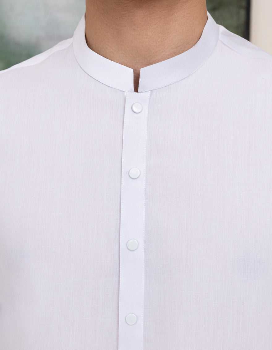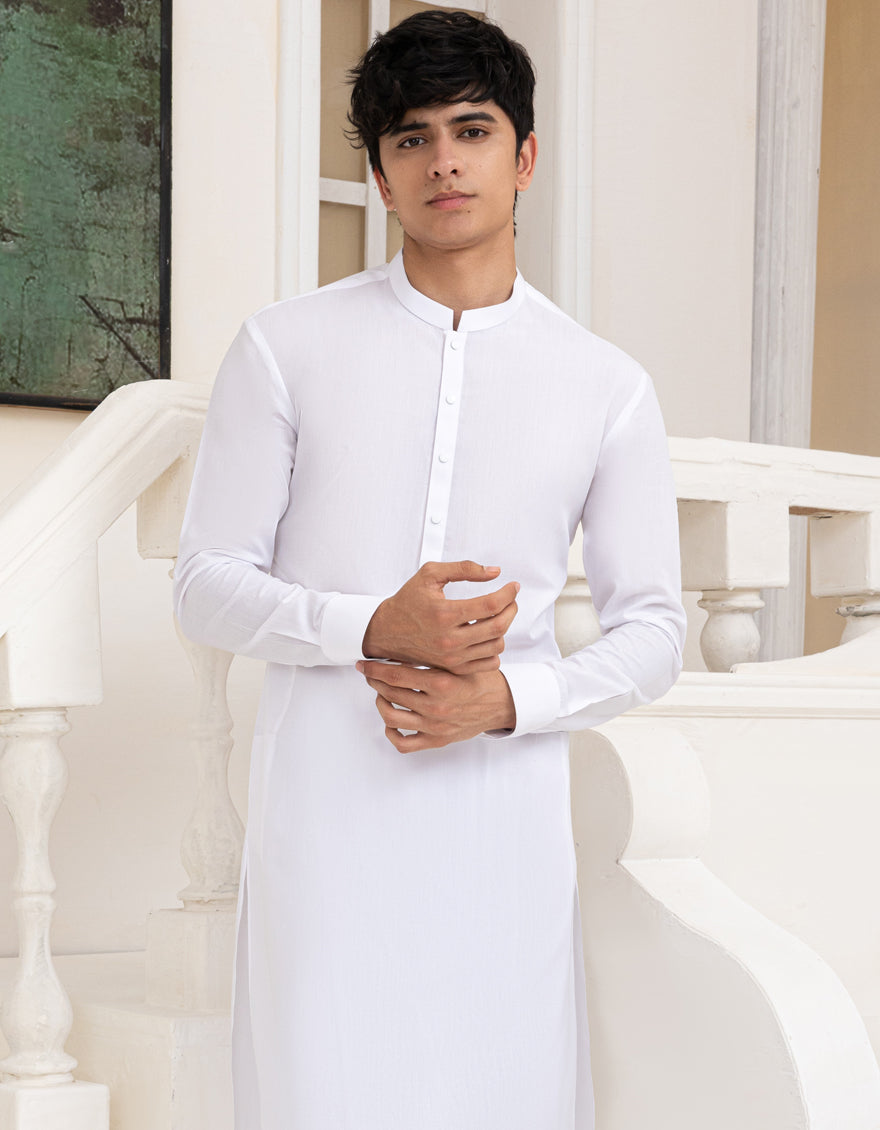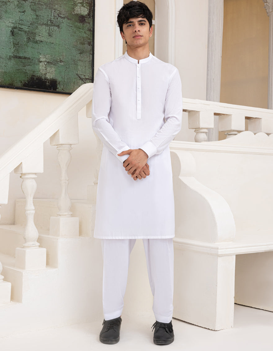A perfect fusion of tradition and contemporary fashion, this White Blended Kameez Shalwar for teen boys exudes effortless style. Its classic appeal offers versatility, suitable for a wide range of events and environments.