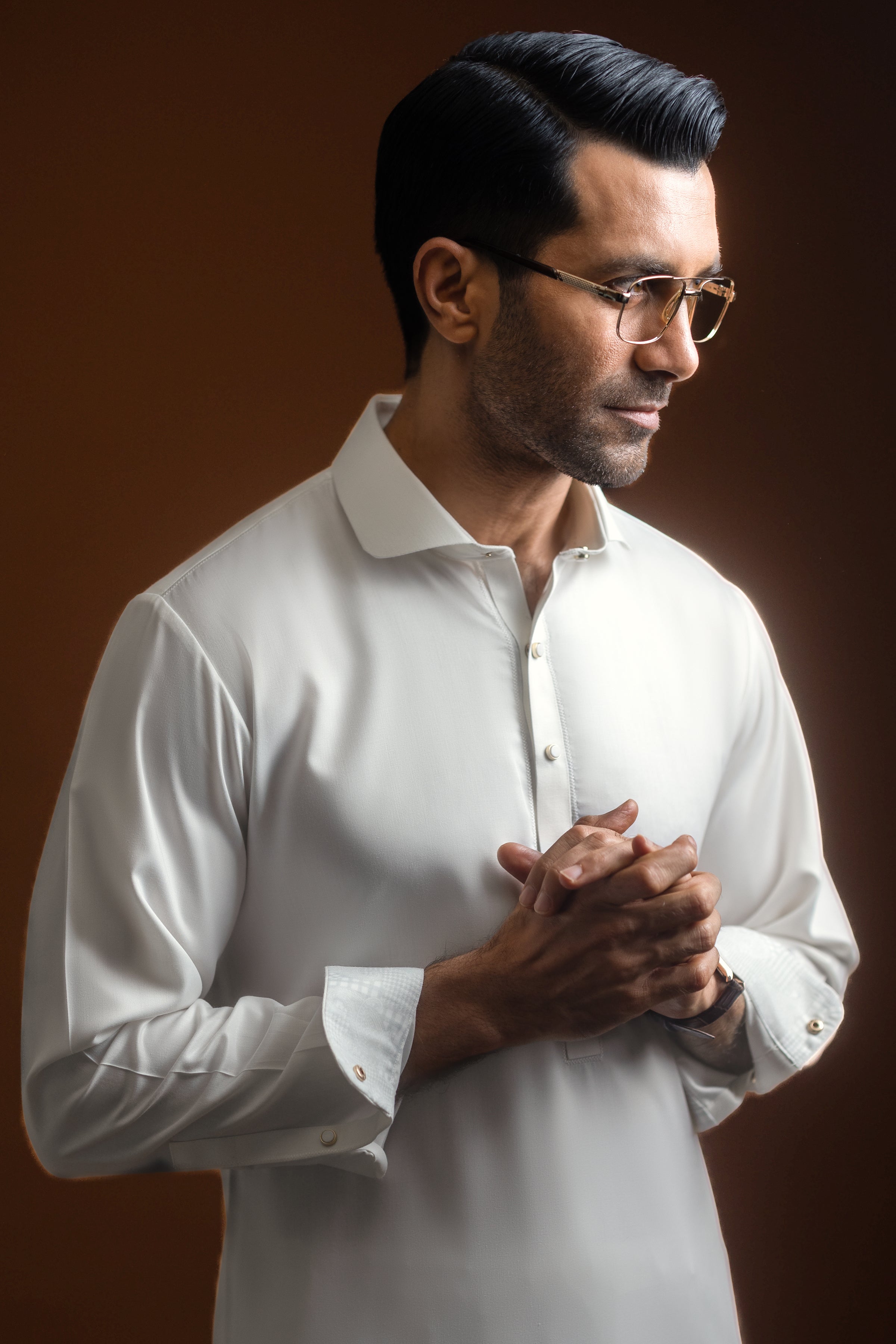 Round edge shirt collar with cuffs. Embroidery at front, yoke, cuffs & sleeve vent. Square hem.