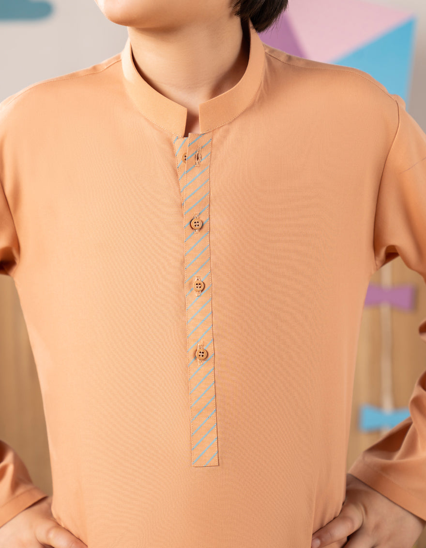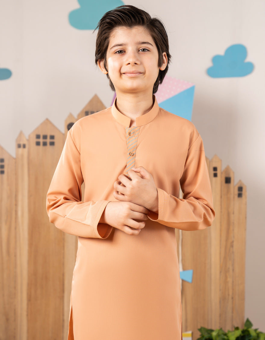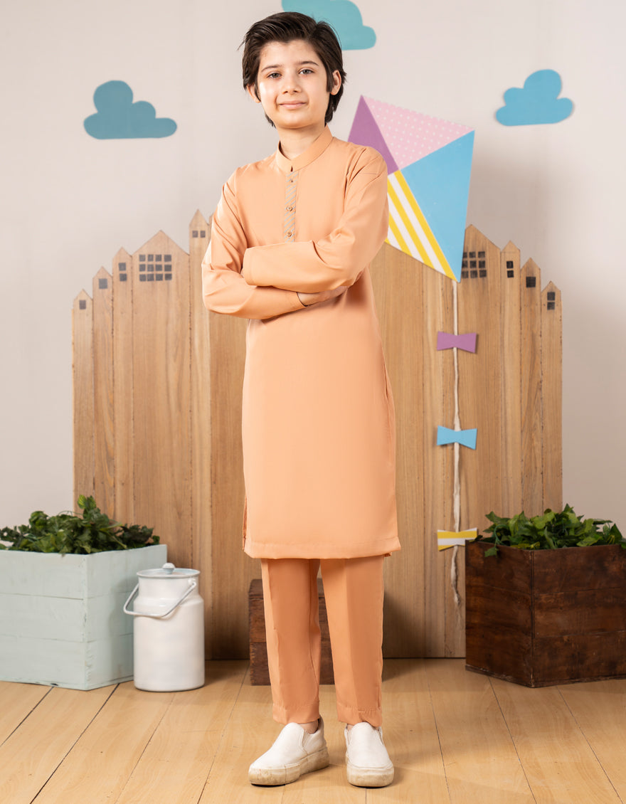 Simple and comfortable, this Peach Blended Kurta Trouser is perfect for young boys. Its classic design makes it ideal for everyday wear and special occasions alike.