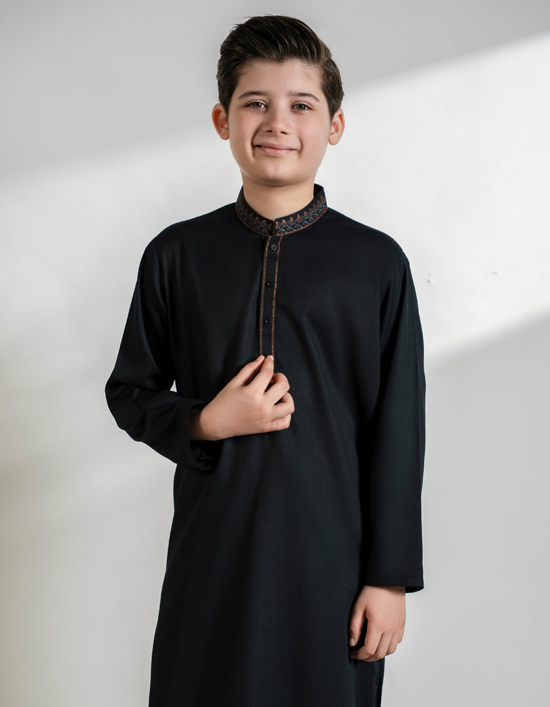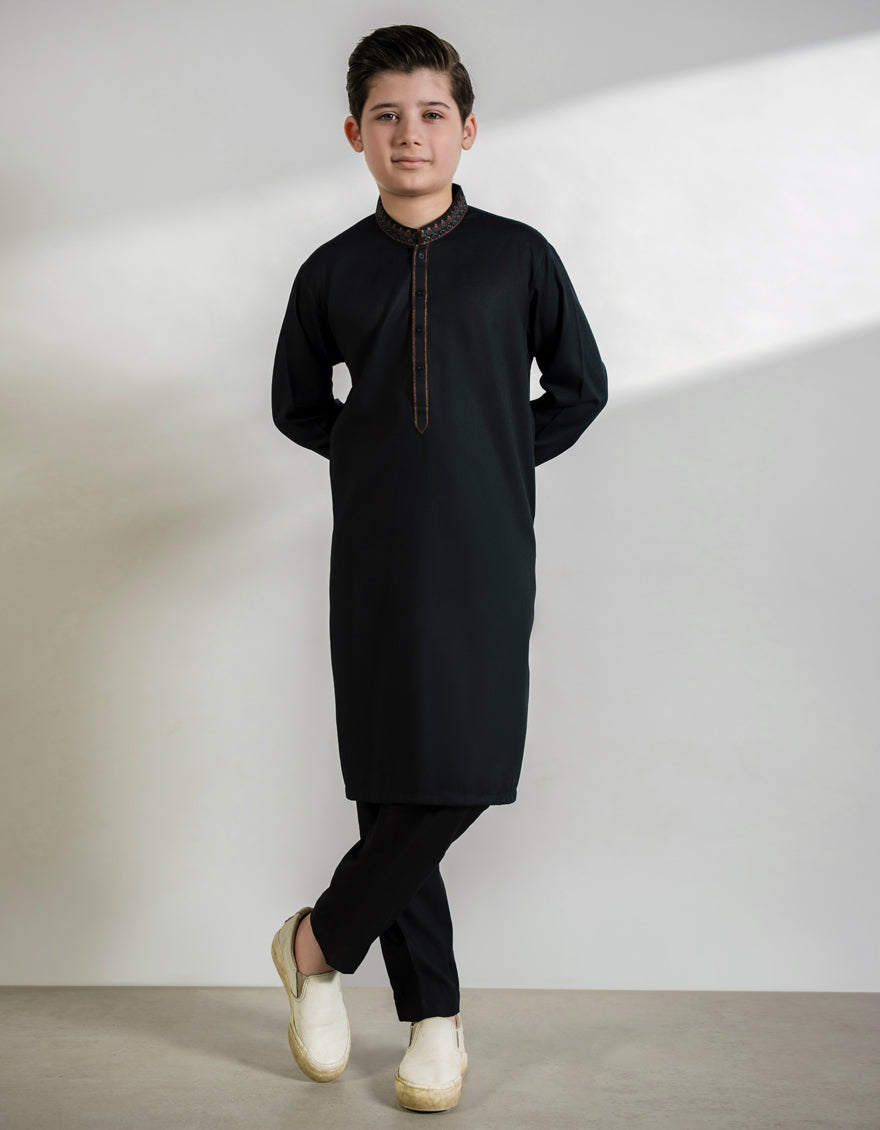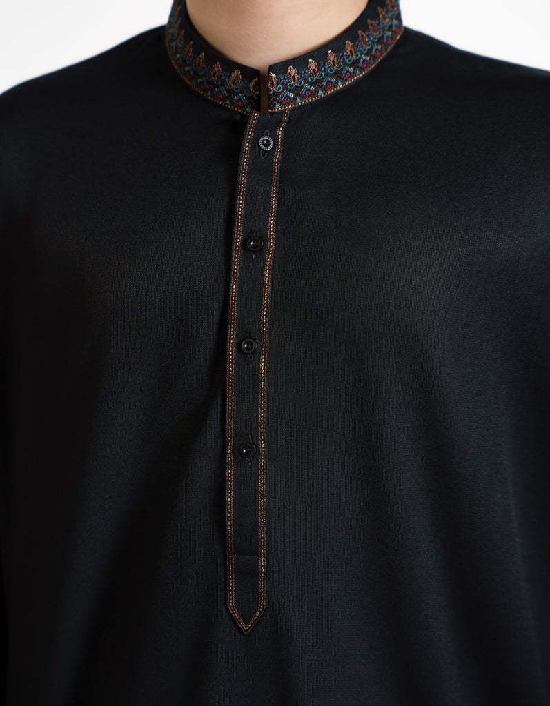 Designed for a sharper, more structured appearance, this Black Blended Kurta Trousers set offers a modern fit with clean lines. The kurta features subtle detailing, while the straight-cut trousers ensure a neat silhouette. Perfect for events, workdays, or weekend wear.