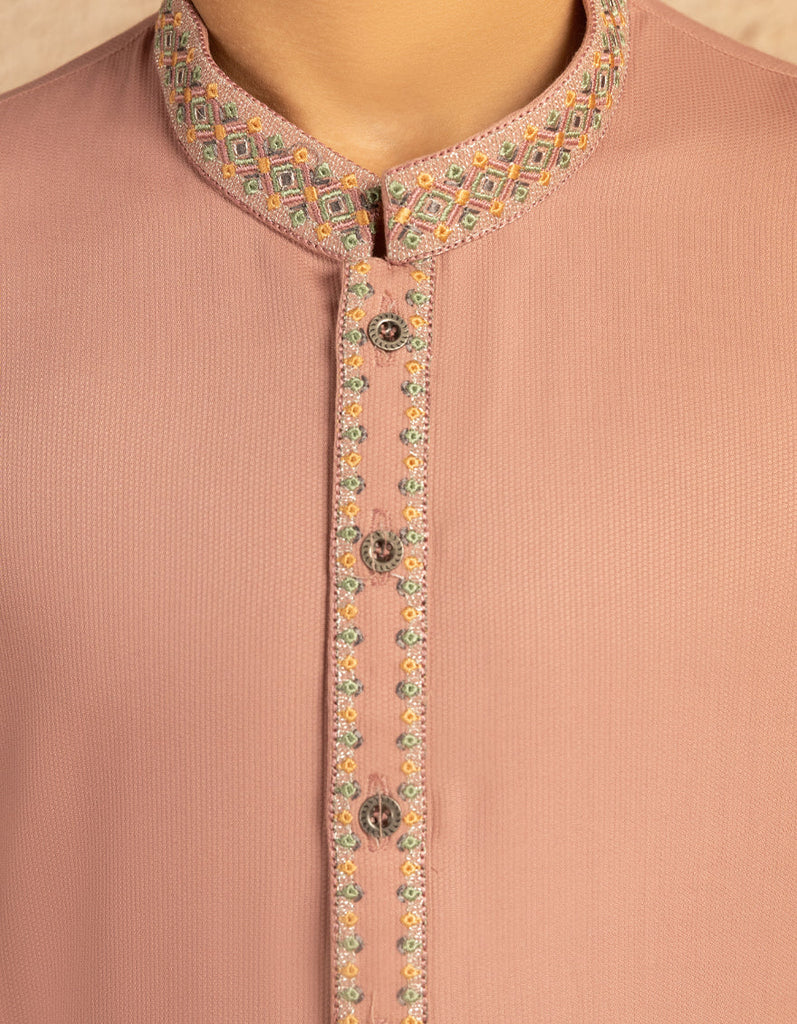 Designed with a refined touch, this tea pink blended semi-formal kurta trouser set offers a clean look that's ideal for small events, meetups, or evening wear.