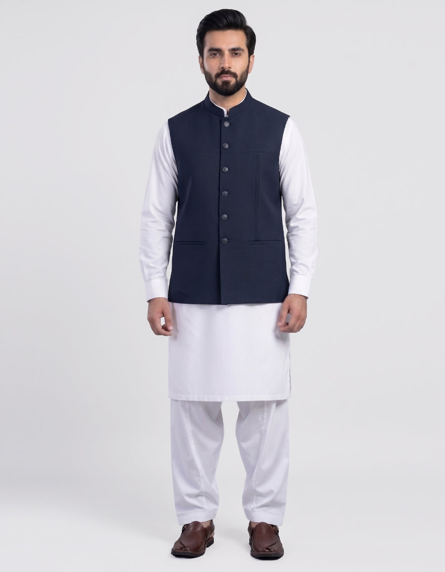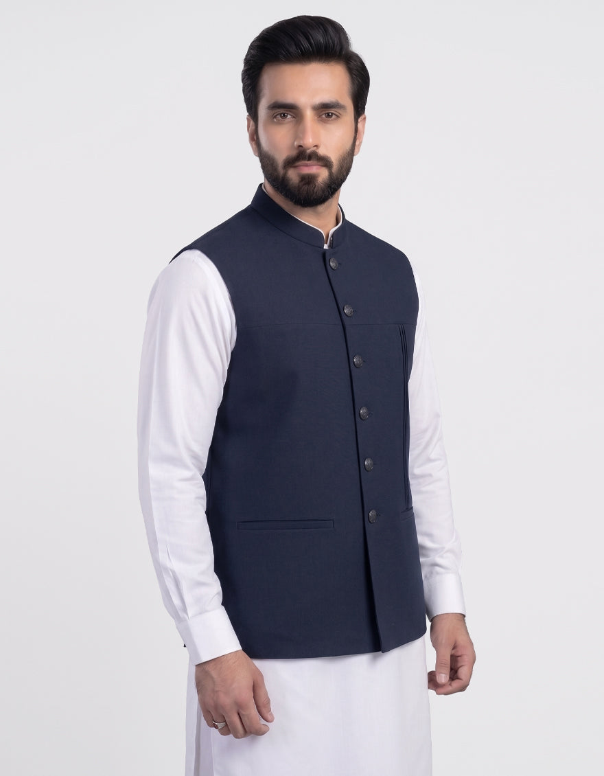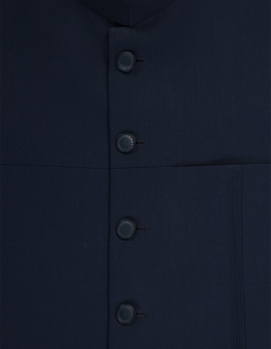 A sophisticated navy blue waistcoat crafted from blended fabric for durability and smooth texture. Designed to complement traditional outfits while adding a refined and polished appearance.