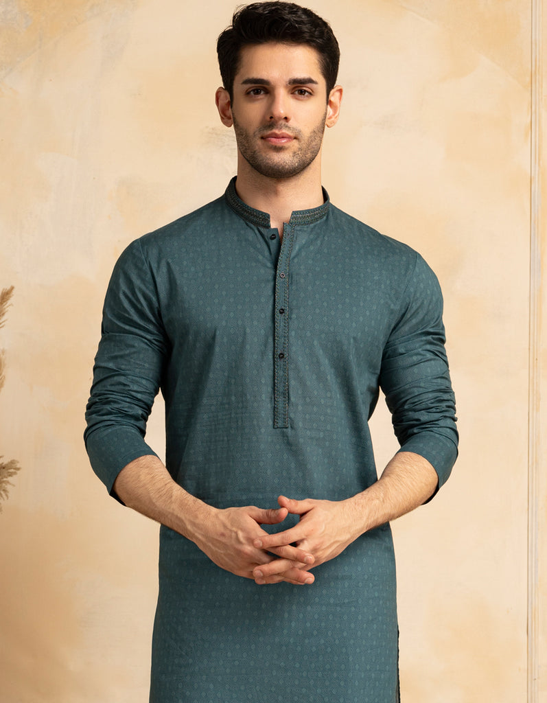 This Teal Cotton Semi-Formal Kurta has a simple yet elegant look, combining tradition with a modern touch.