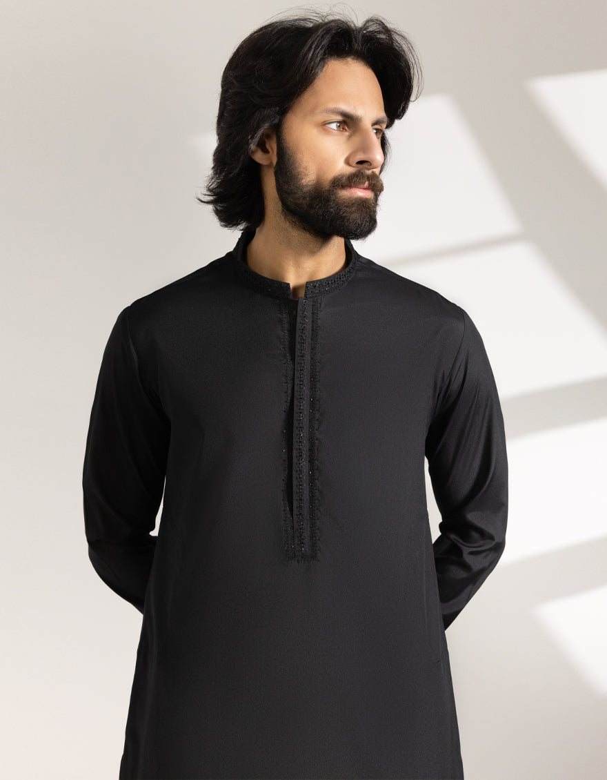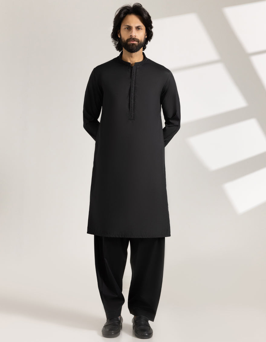A classic eastern wear set designed with clean stitching and thoughtful detailing. The Black Blended Formal Kameez Shalwar offers a neat look & comfortable fit - ideal for long wear, daily use, or special occasions with a touch of tradition.