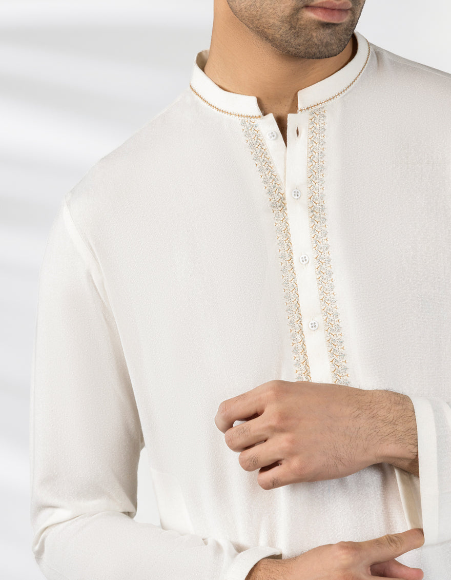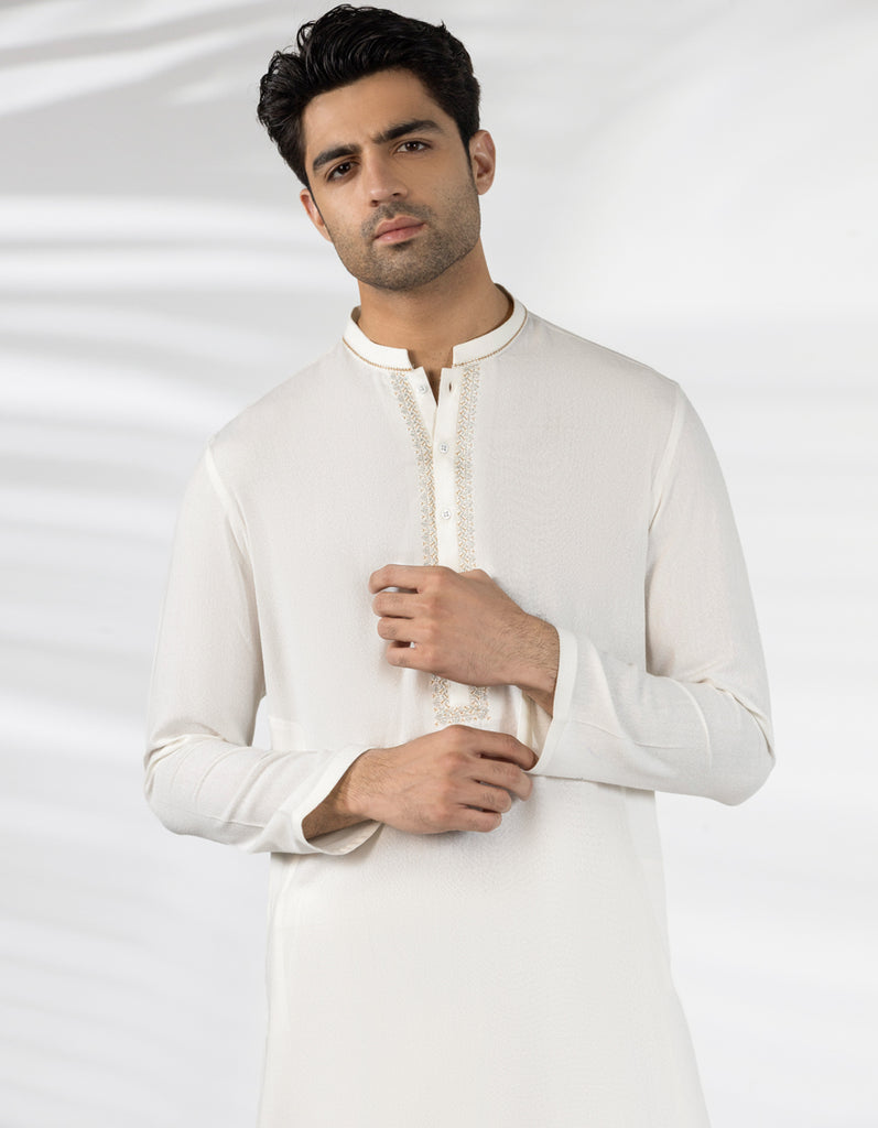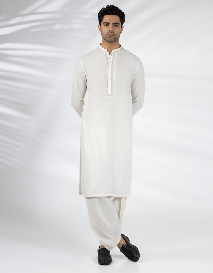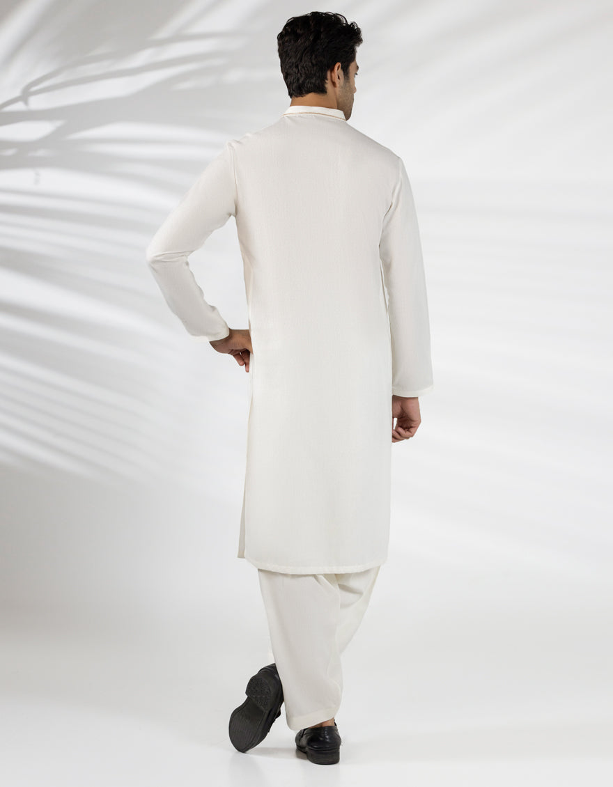 A classic eastern wear set designed with clean stitching and thoughtful detailing. The Off White Blended Formal Kameez Shalwar offers a neat look & comfortable fit - ideal for long wear, daily use, or special occasions with a touch of tradition.