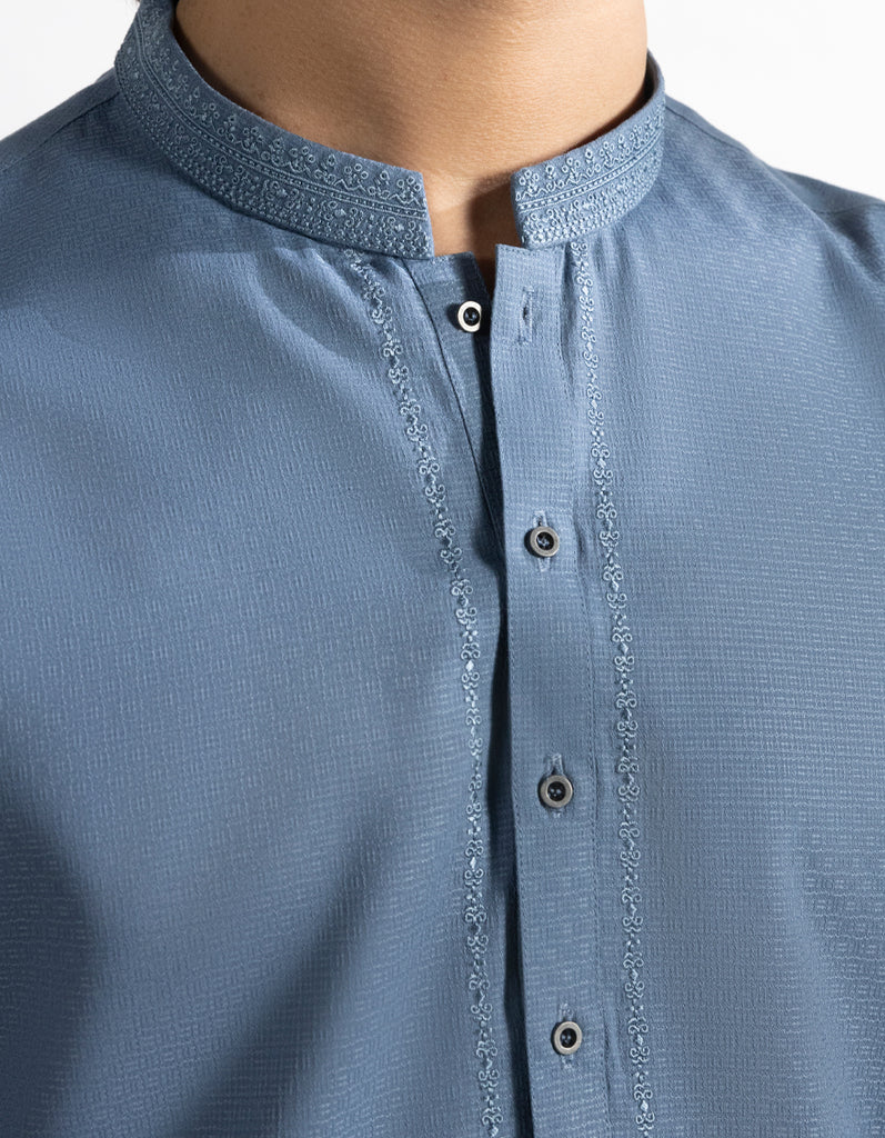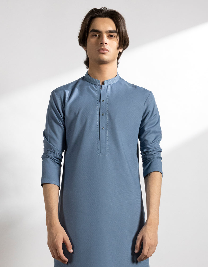 A well-crafted Sky Blue Blended Kurta featuring detailed stitching and tasteful patterns. Contrasting or matching buttons give it a stylish edge without losing its elegant charm. A smart choice for teens who prefer a decent yet trendy outfit.