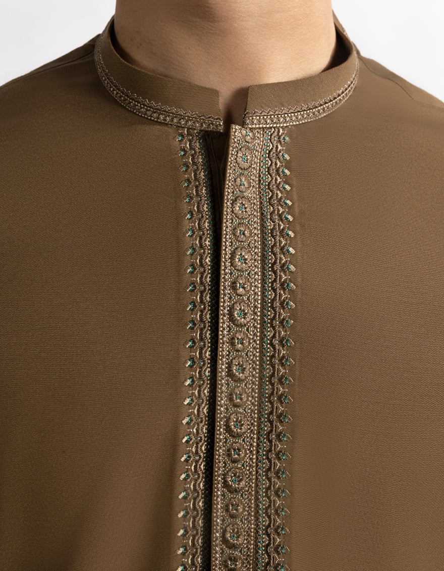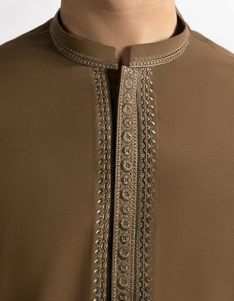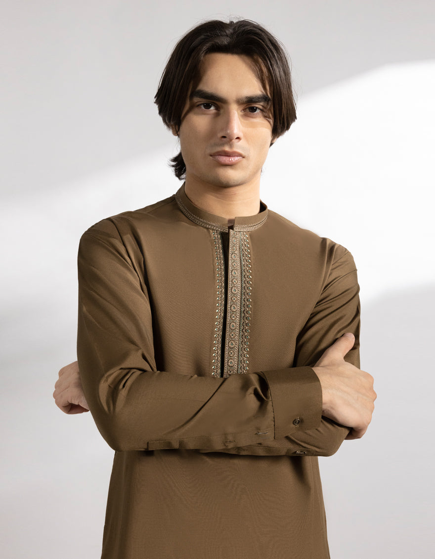 This Brown Blended Kameez Shalwar stands out with its fine stitching and a unique touch of design. Subtle patterns and smart button detailing add to its appeal. A graceful pick that blends decency with a stylish look.