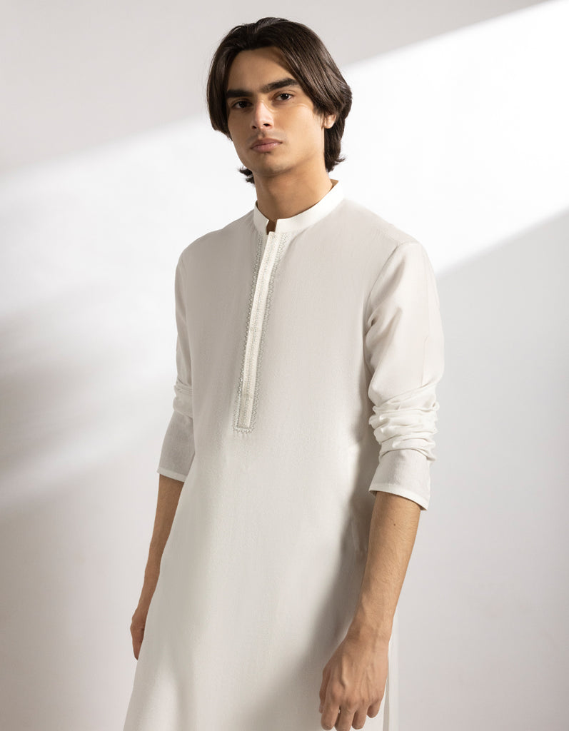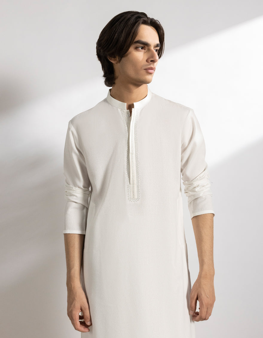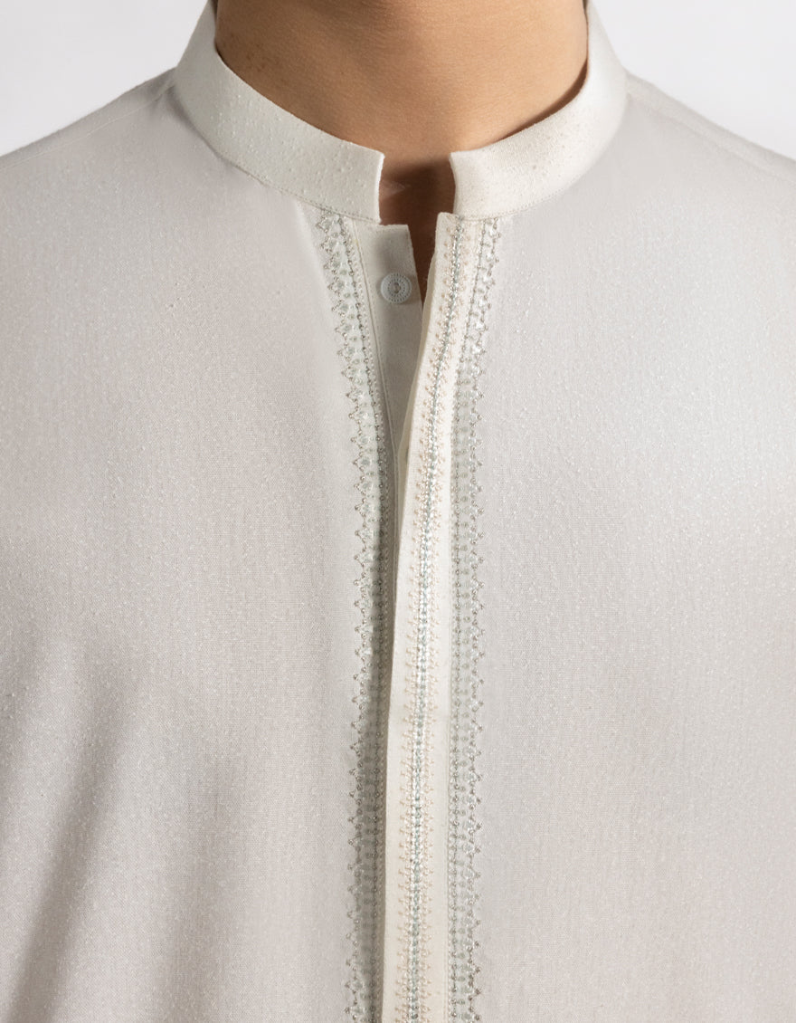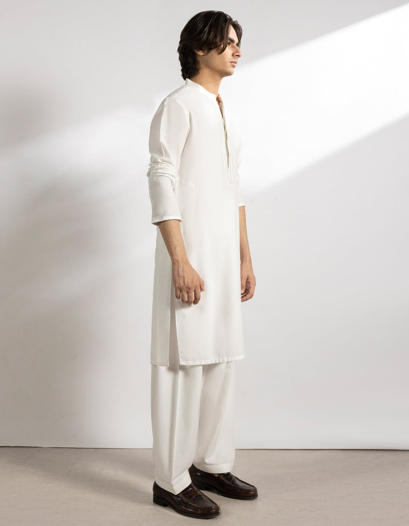 This White Blended Kameez Shalwar stands out with its fine stitching and a unique touch of design. Subtle patterns and smart button detailing add to its appeal. A graceful pick that blends decency with a stylish look.