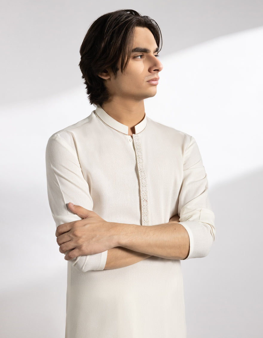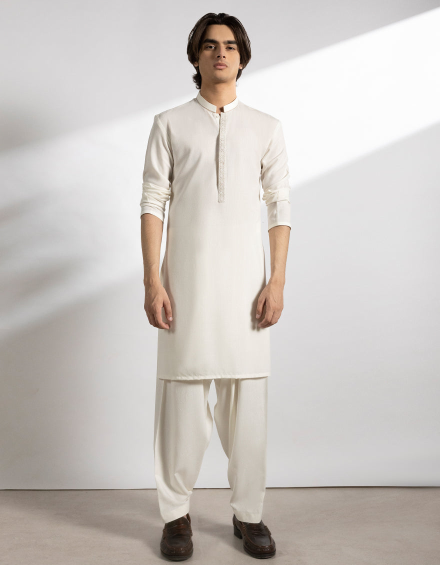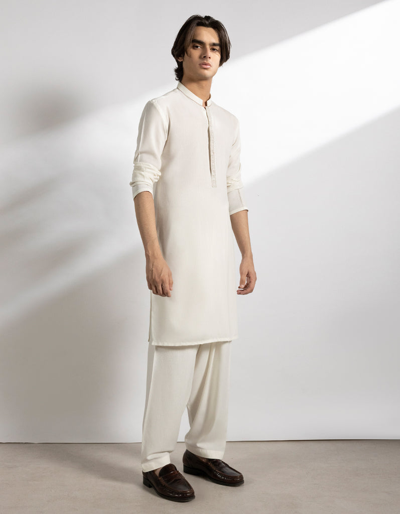 This Off White Blended Kameez Shalwar stands out with its fine stitching and a unique touch of design. Subtle patterns and smart button detailing add to its appeal. A graceful pick that blends decency with a stylish look.
