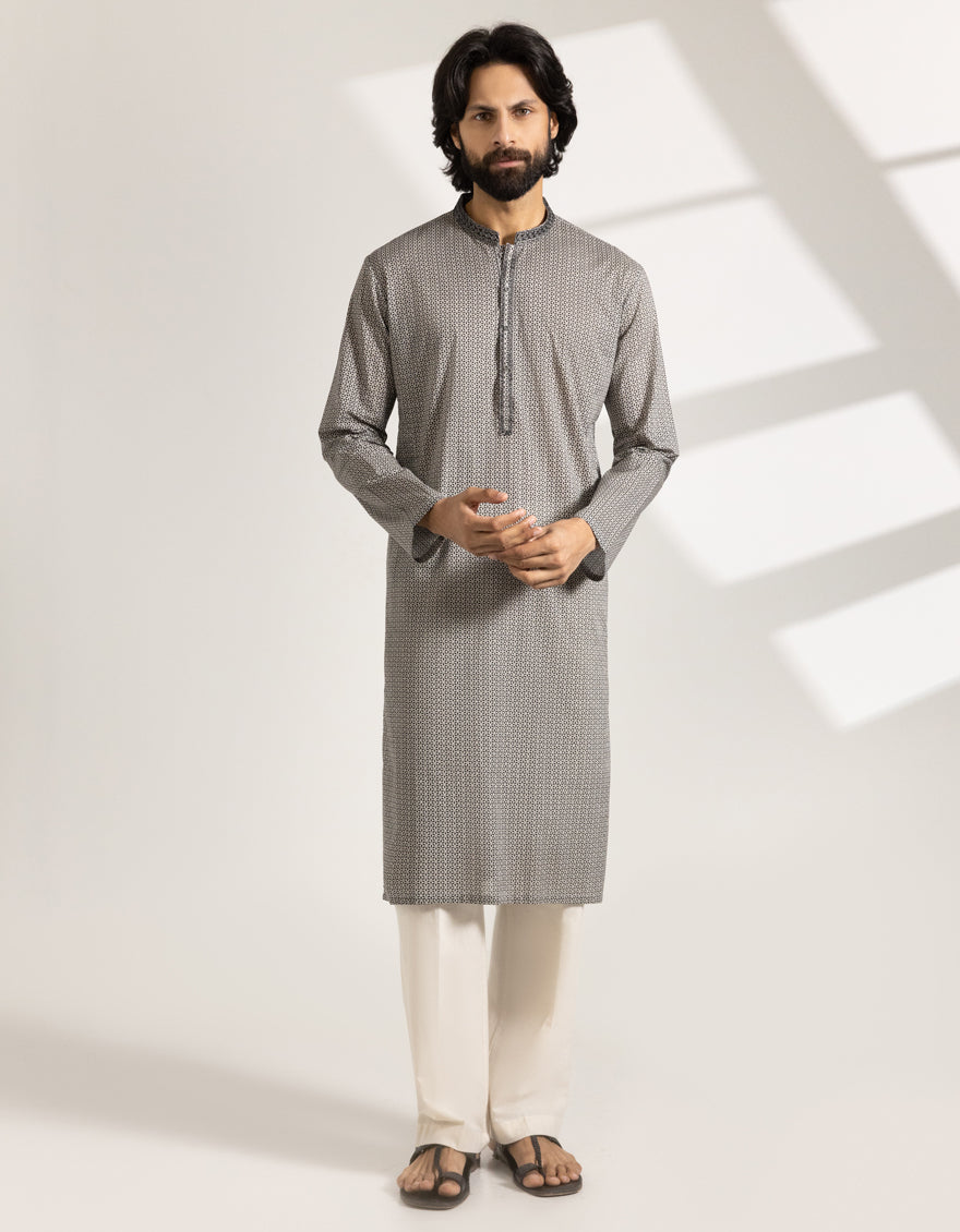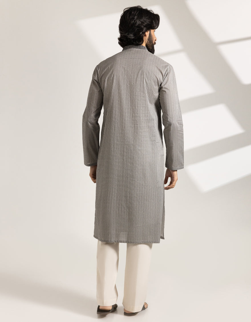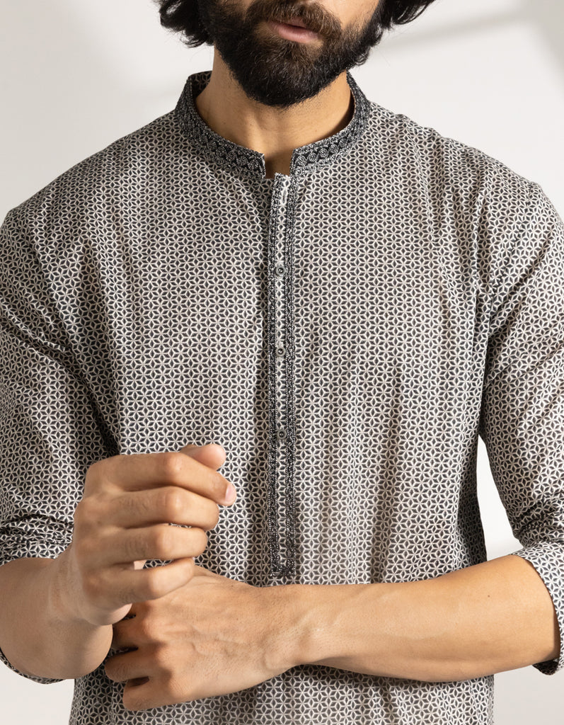 This Black & White Cotton Printed Semi-Formal Kurta combines elegance with simplicity. Finished with detailed stitching and smart button styling, it's ideal for semi-formal occasions or casual meetups. A versatile piece that carries both ease and refinement.