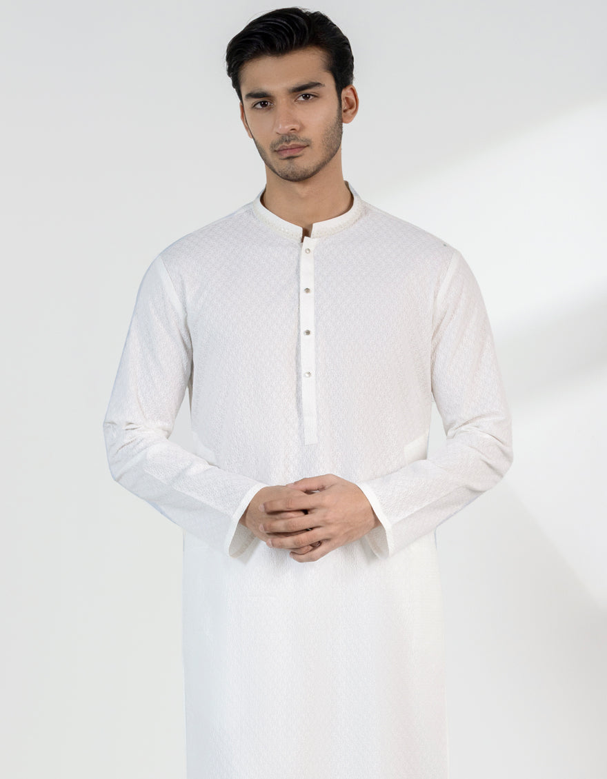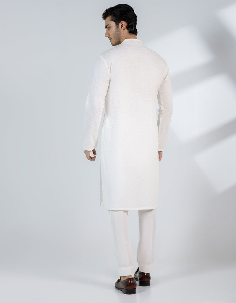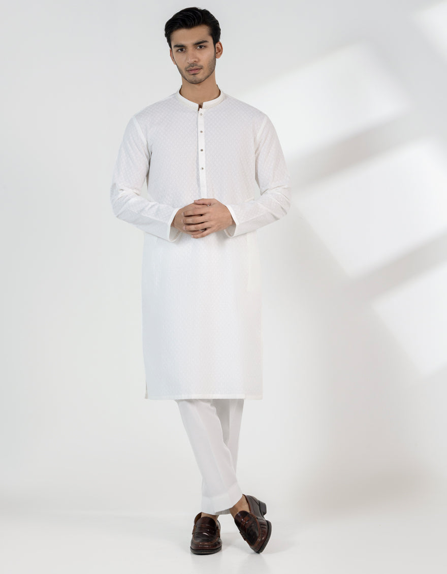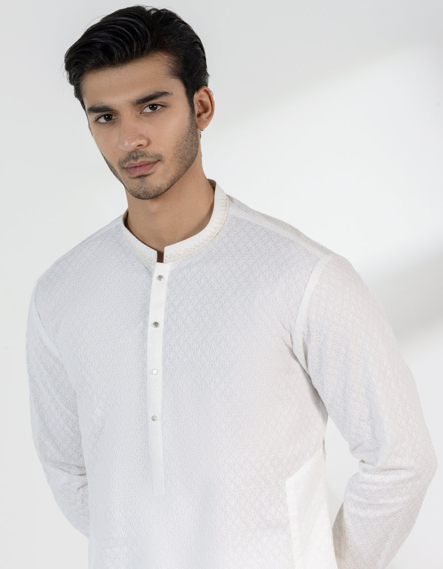 This Off White Cotton Schiffli Formal Kurta combines elegance with simplicity. Finished with detailed stitching and smart button styling, it's ideal for semi-formal occasions or casual meetups. A versatile piece that carries both ease and refinement.