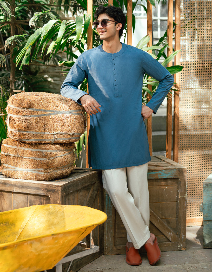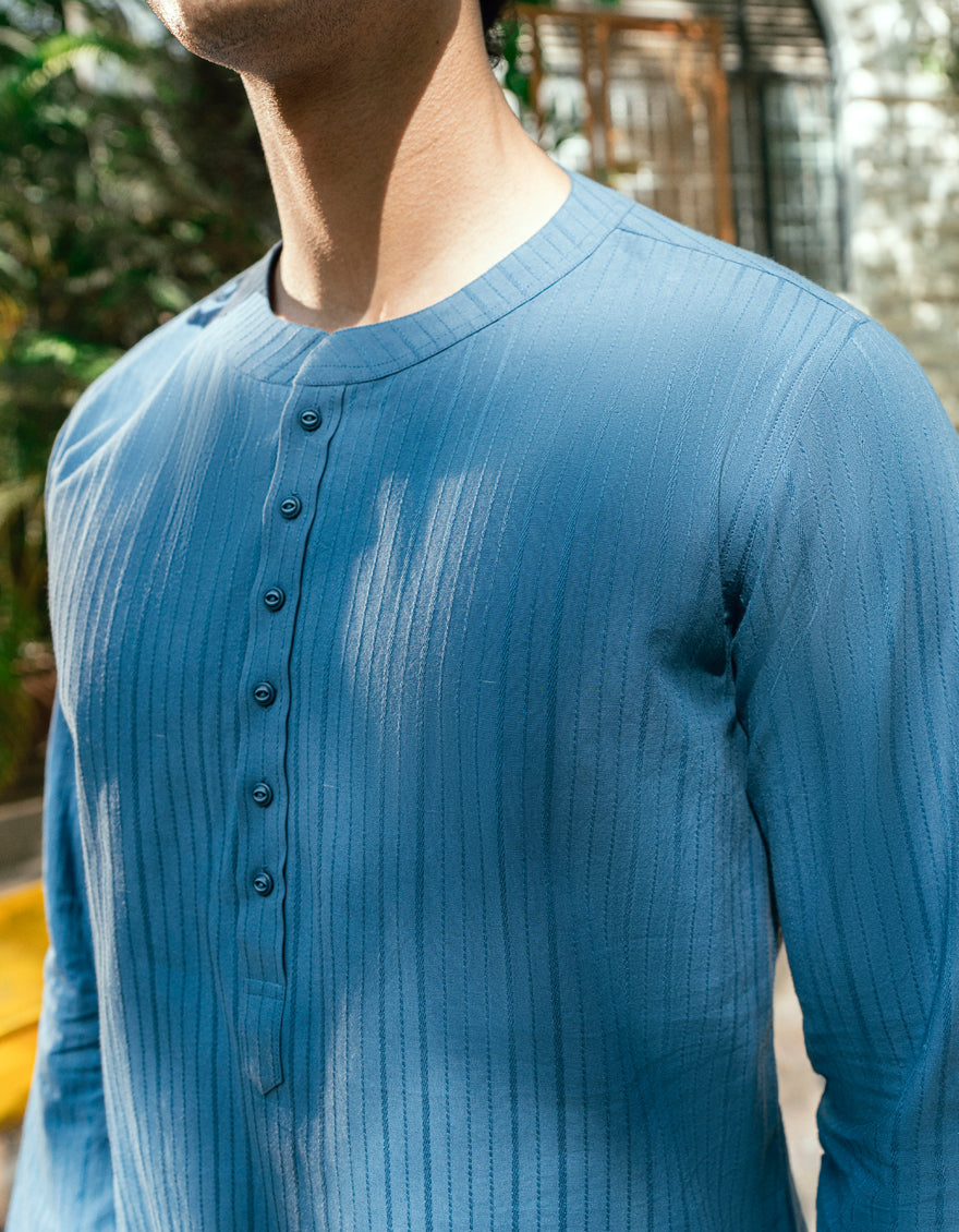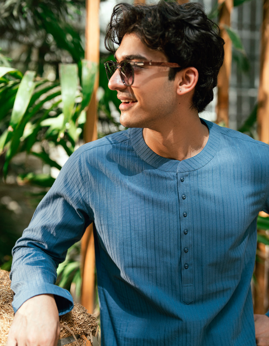 This dull blue bunnat cotton casual short kurta combines classic style with modern simplicity. Featuring a comfortable thigh-length cut, it's designed for easy, everyday wear.