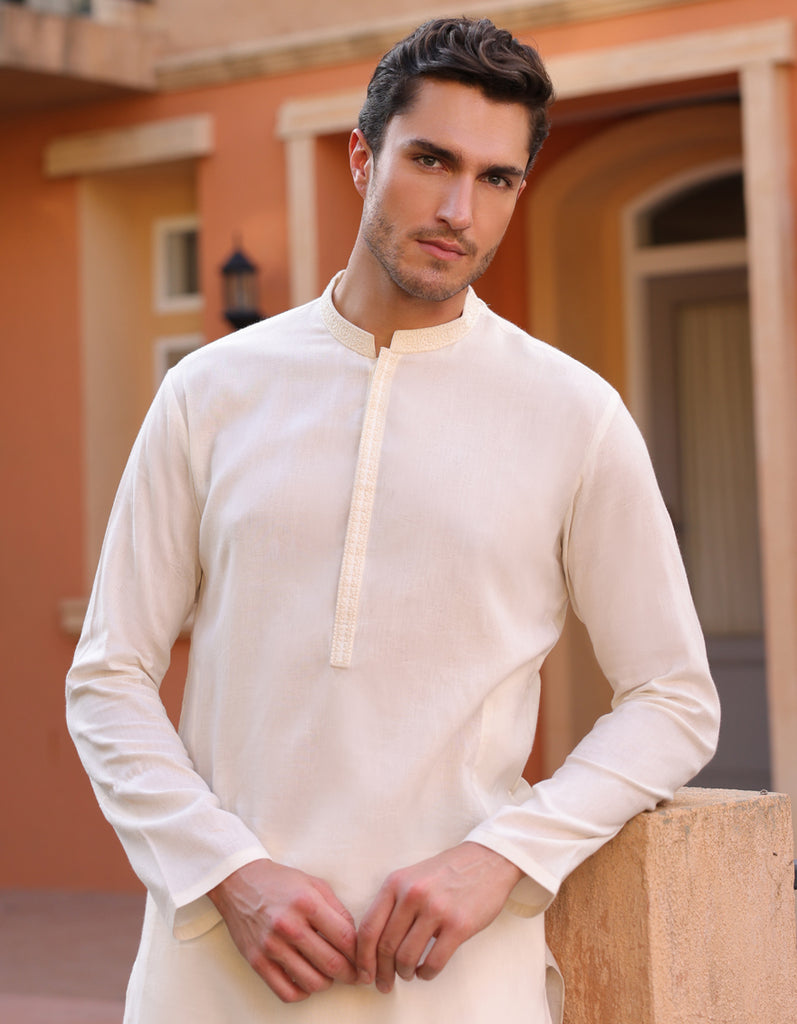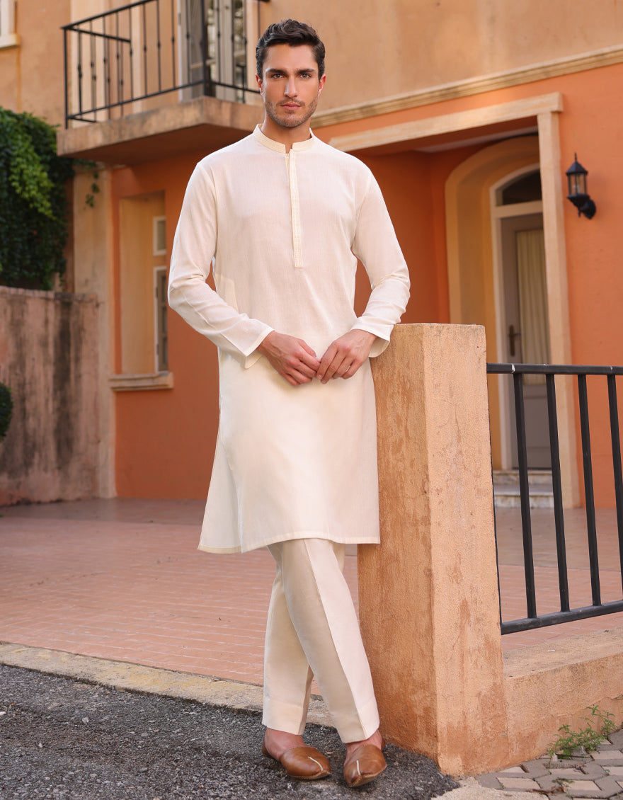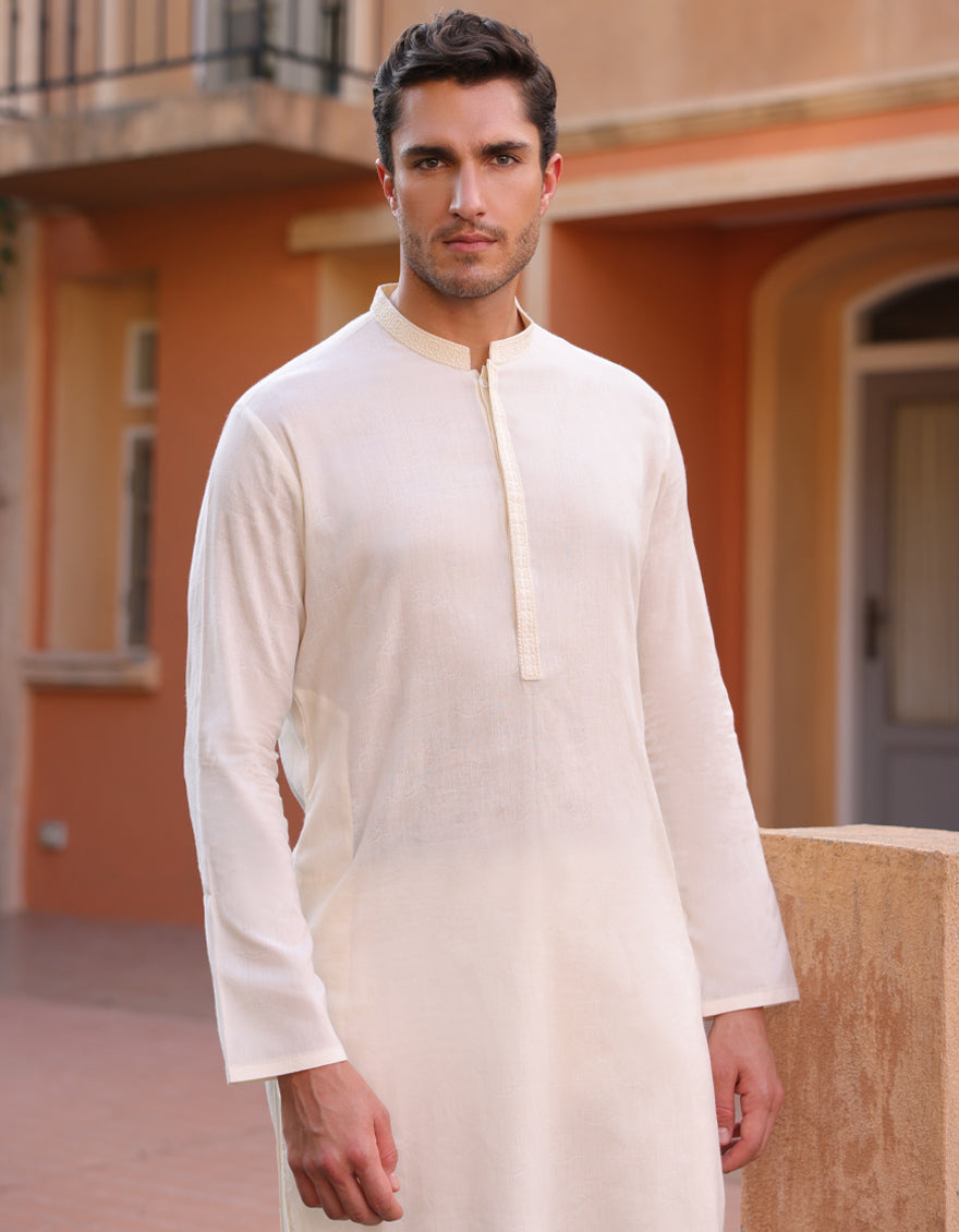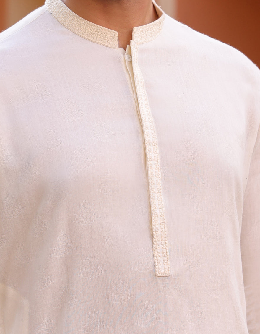 This semi-formal Off White Cotton Kurta exudes understated elegance, striking the perfect balance between traditional charm and contemporary sophistication.