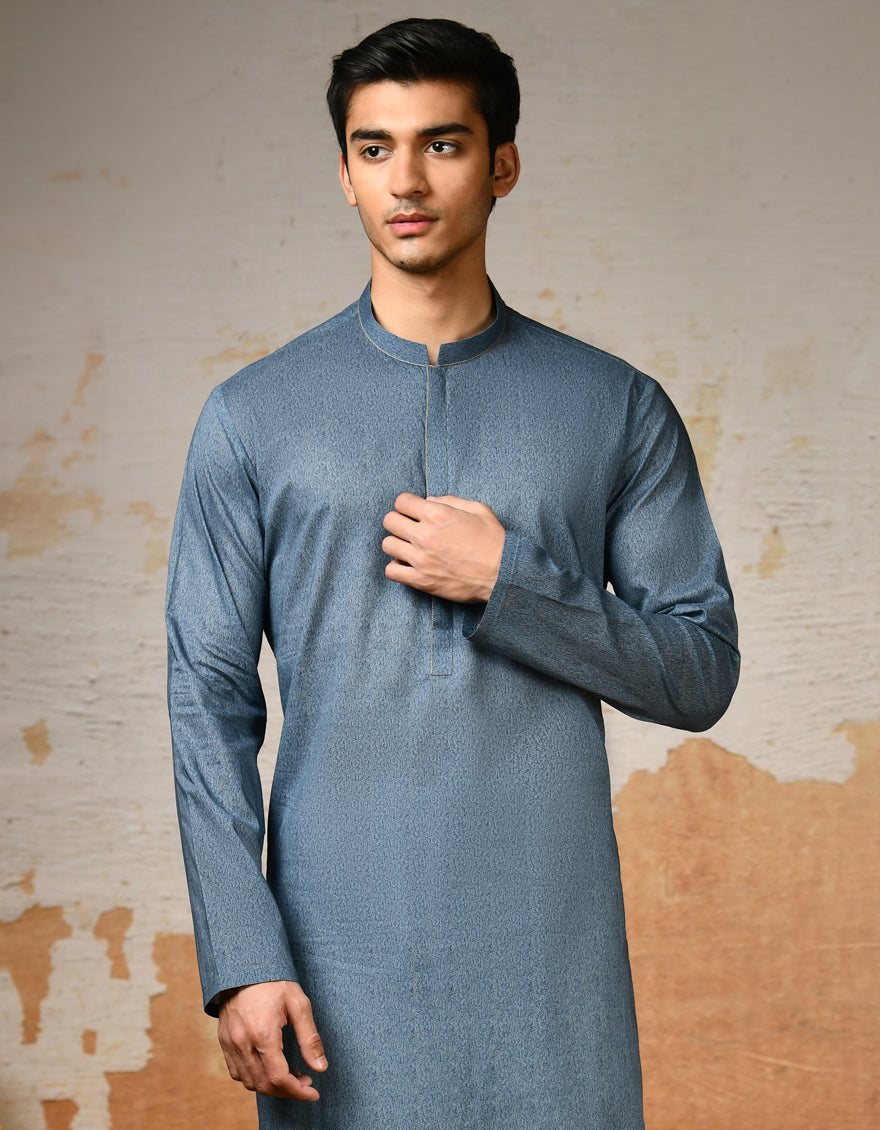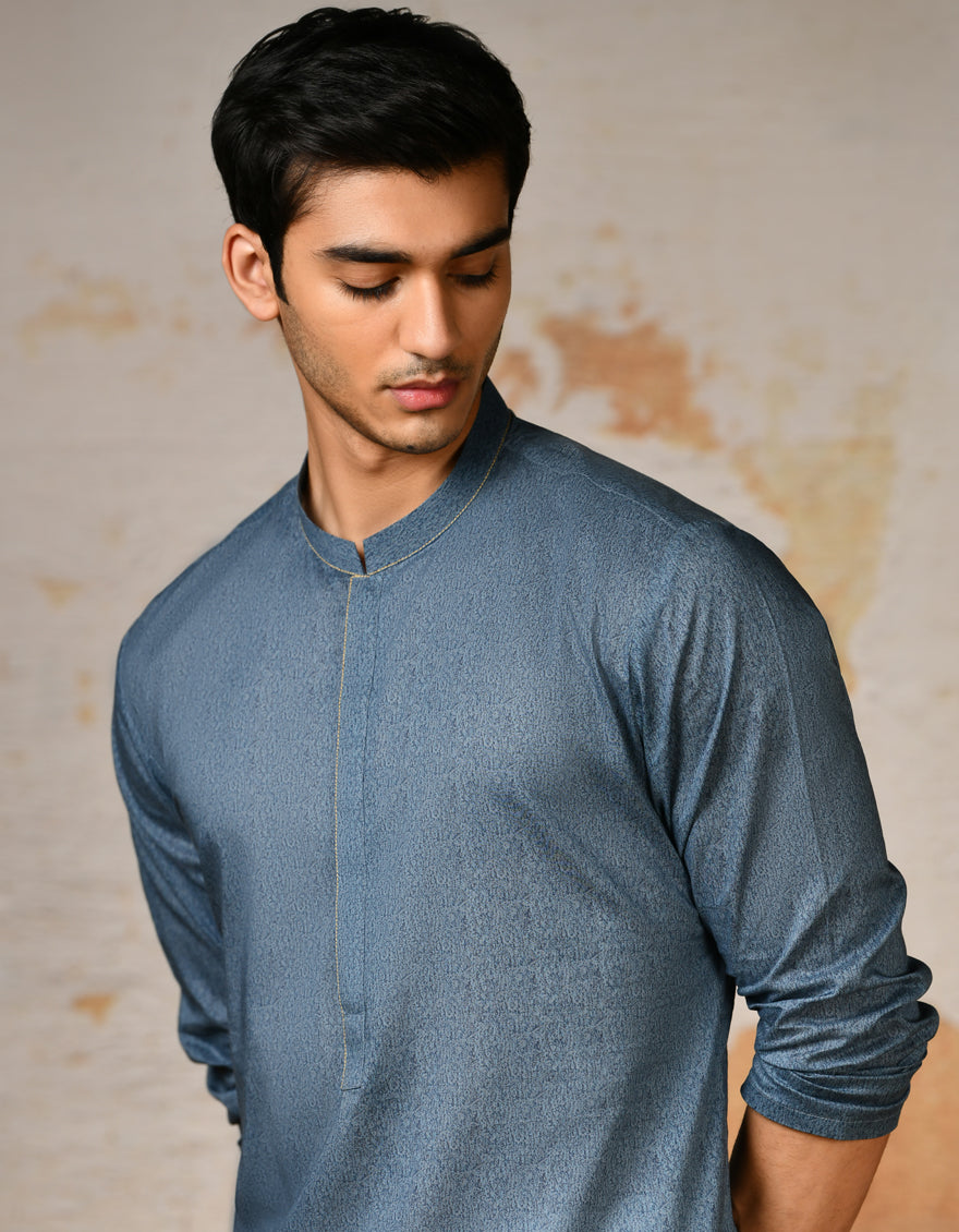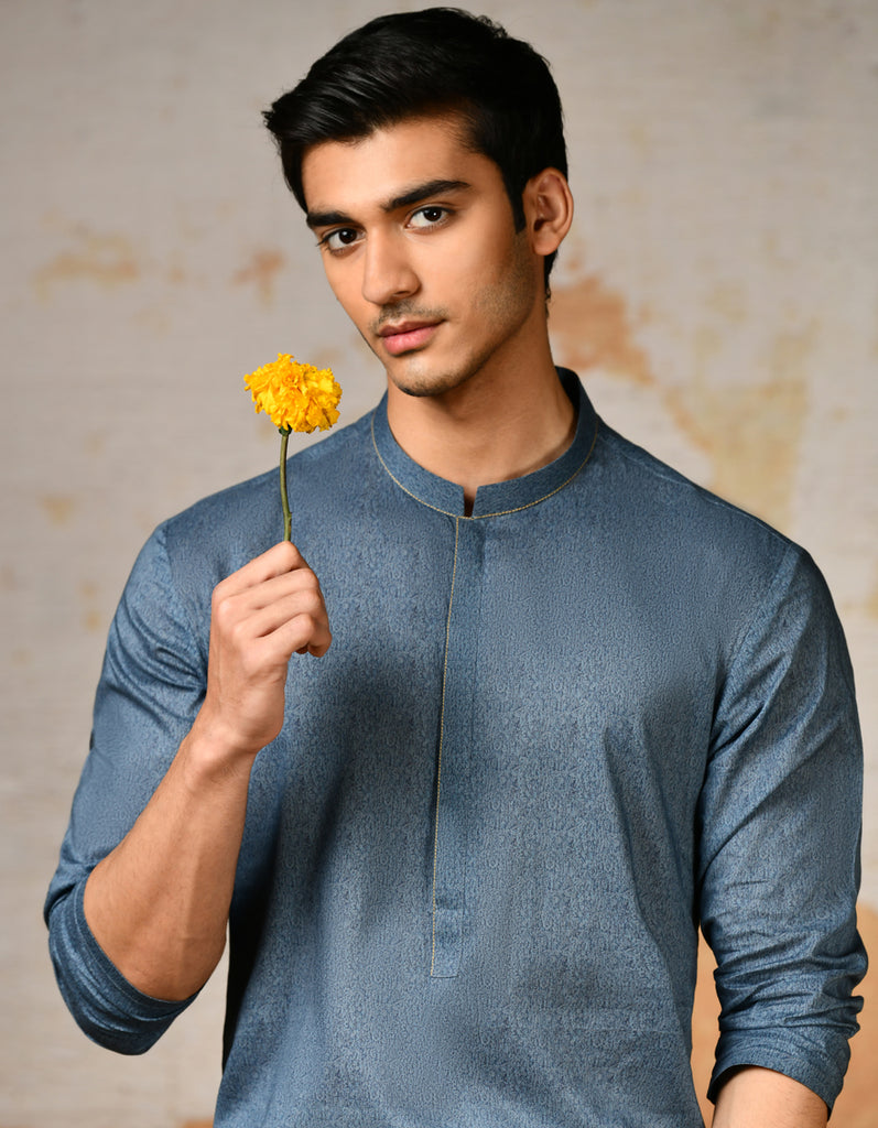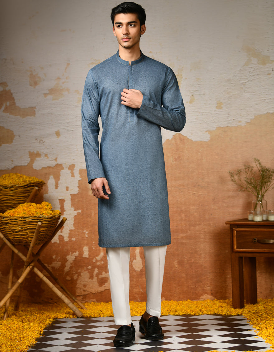 Elevate your attire with this blue cotton semi-formal kurta blending traditional aesthetics with contemporary style for a sophisticated yet relaxed look.