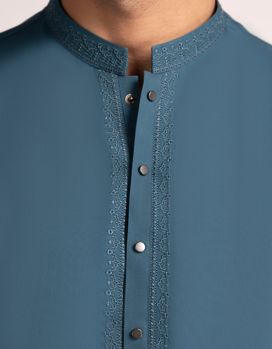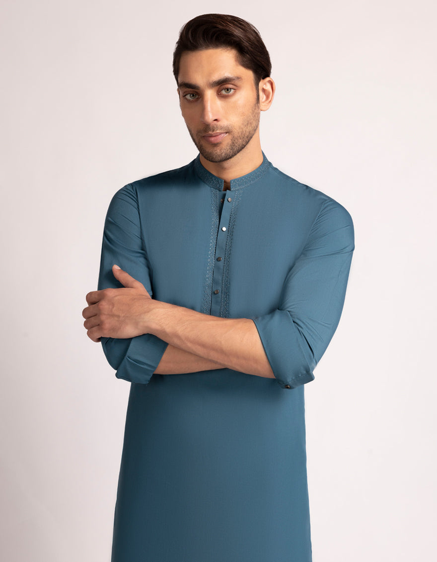 Designed for a sharper, more structured appearance, this Sea Green Kurta Trousers set offers a modern fit with clean lines. The kurta features subtle detailing, while the straight-cut trousers ensure a neat silhouette. Perfect for events, workdays, or weekend wear.