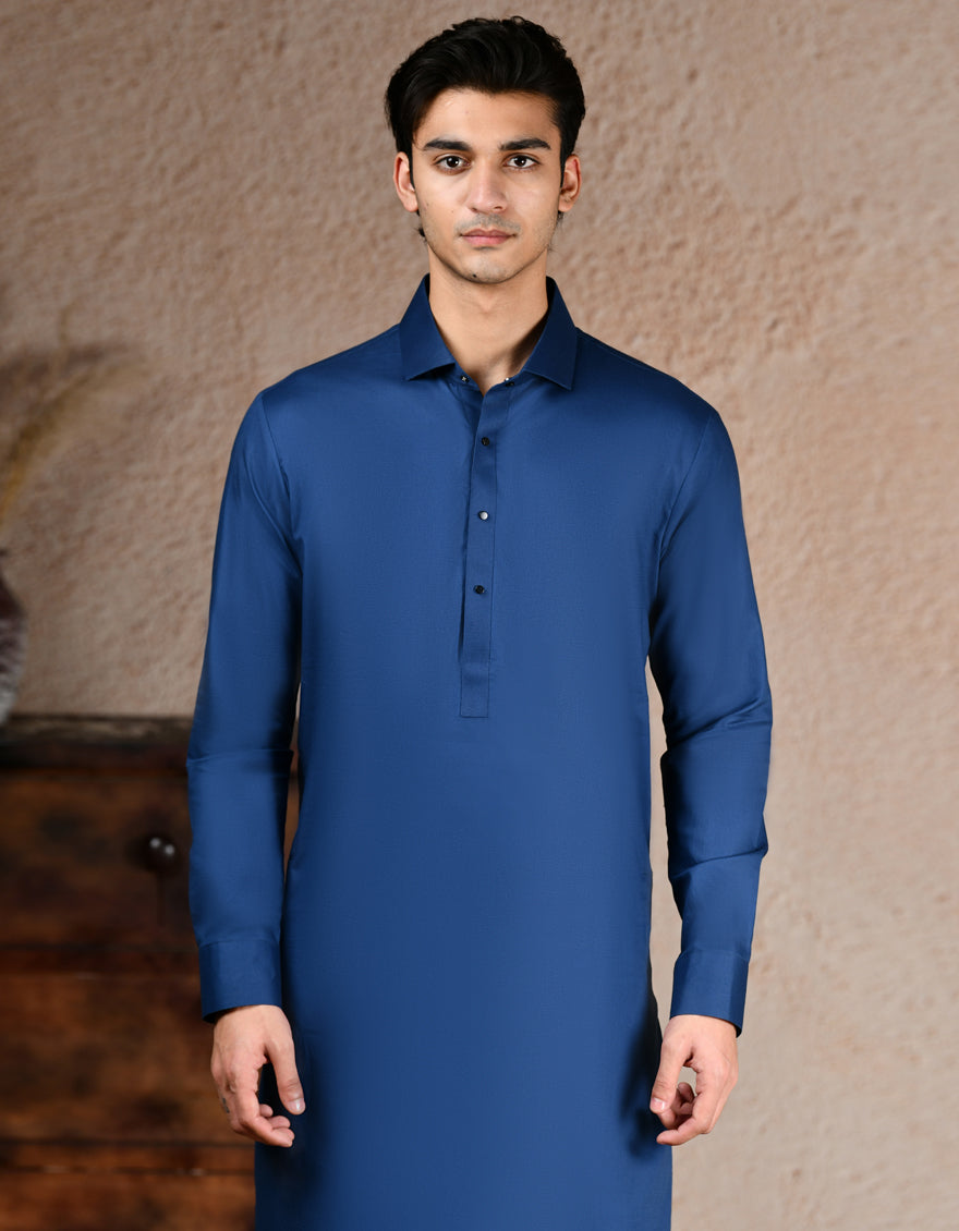 This basic men's Blue Cotton Casual Kameez Shalwar epitomizes effortless sophistication and classic charm, making it a wardrobe staple for various cultural and casual events.