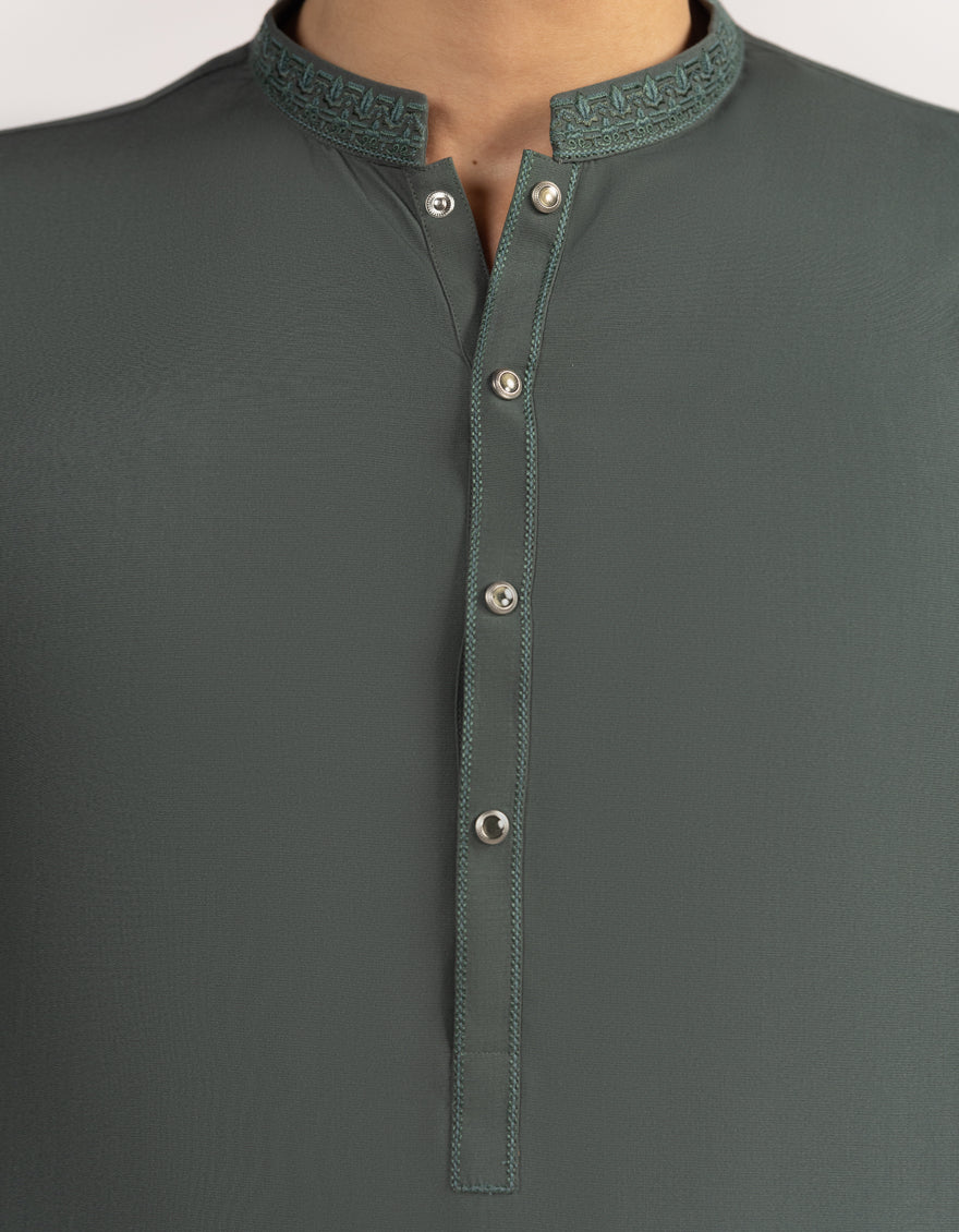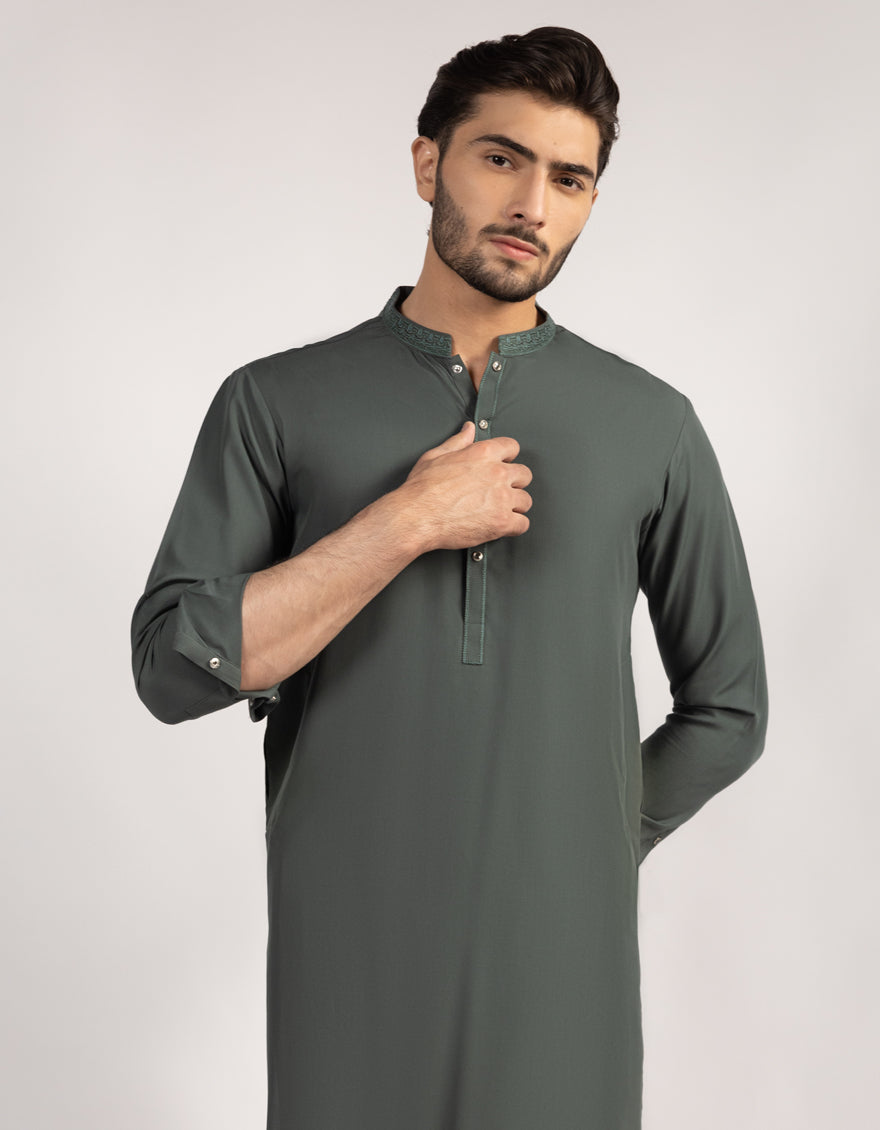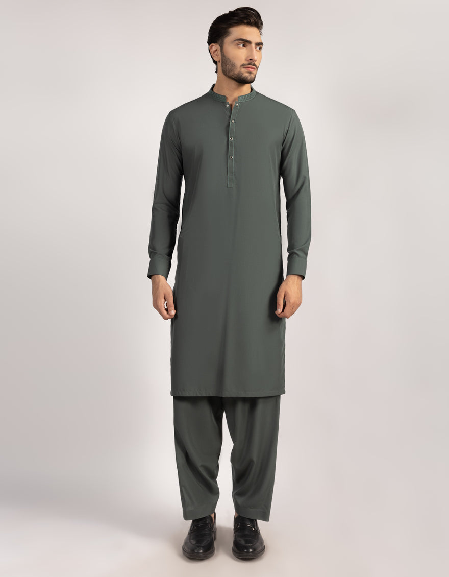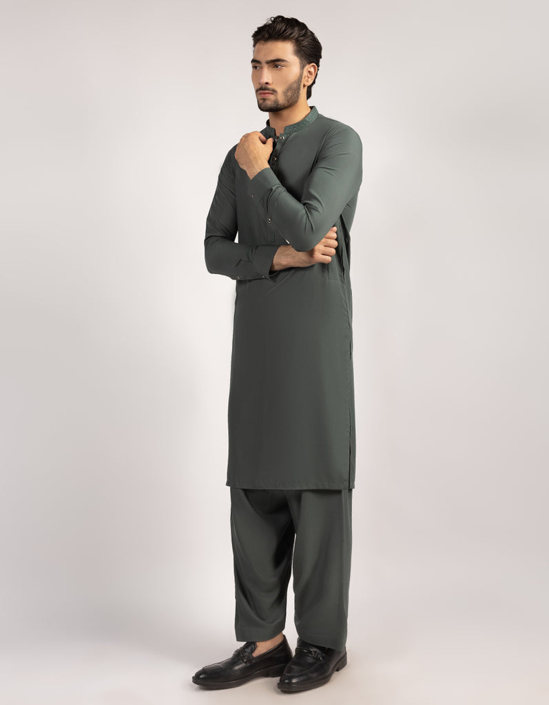 A classic eastern wear set designed with clean stitching and thoughtful detailing. The Dull Green Blended Semi-Formal Kameez Shalwar offers a neat look & comfortable fit - ideal for long wear, daily use, or special occasions with a touch of tradition.