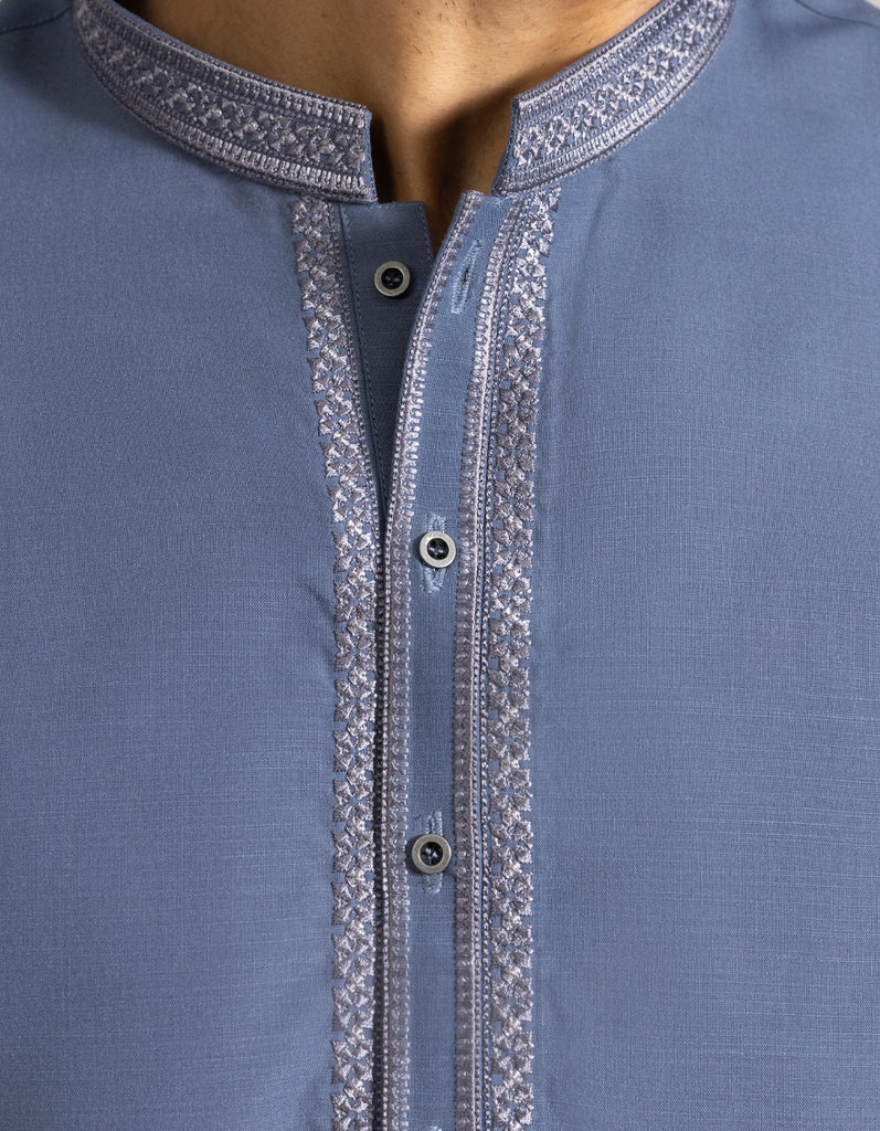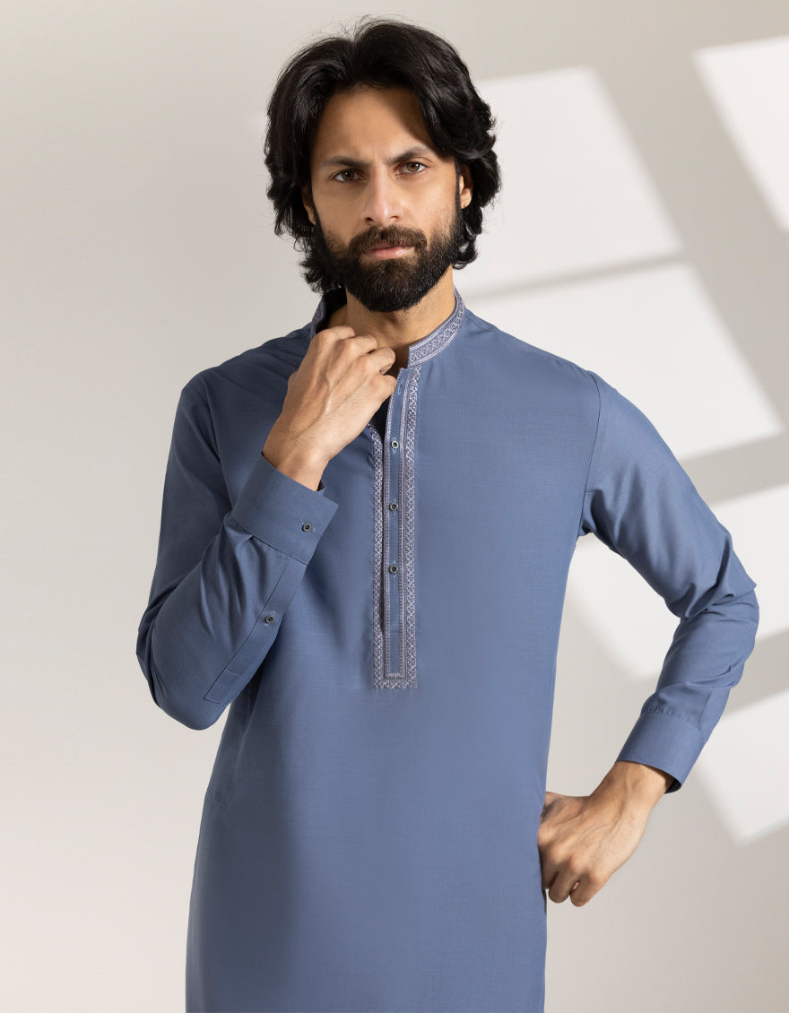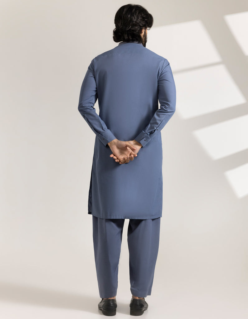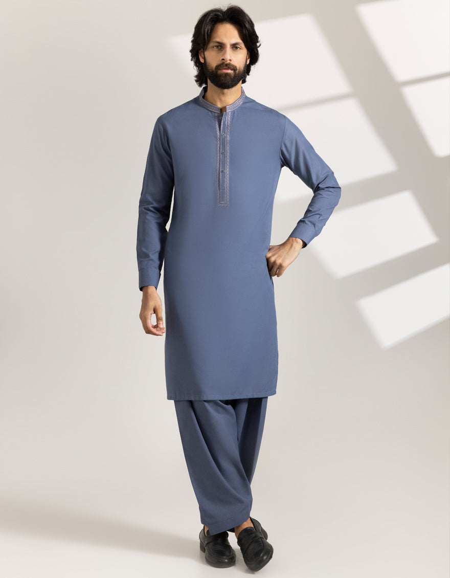 A classic eastern wear set designed with clean stitching and thoughtful detailing. The Greyish Blue Blended Semi-Formal Kameez Shalwar offers a neat look & comfortable fit - ideal for long wear, daily use, or special occasions with a touch of tradition.